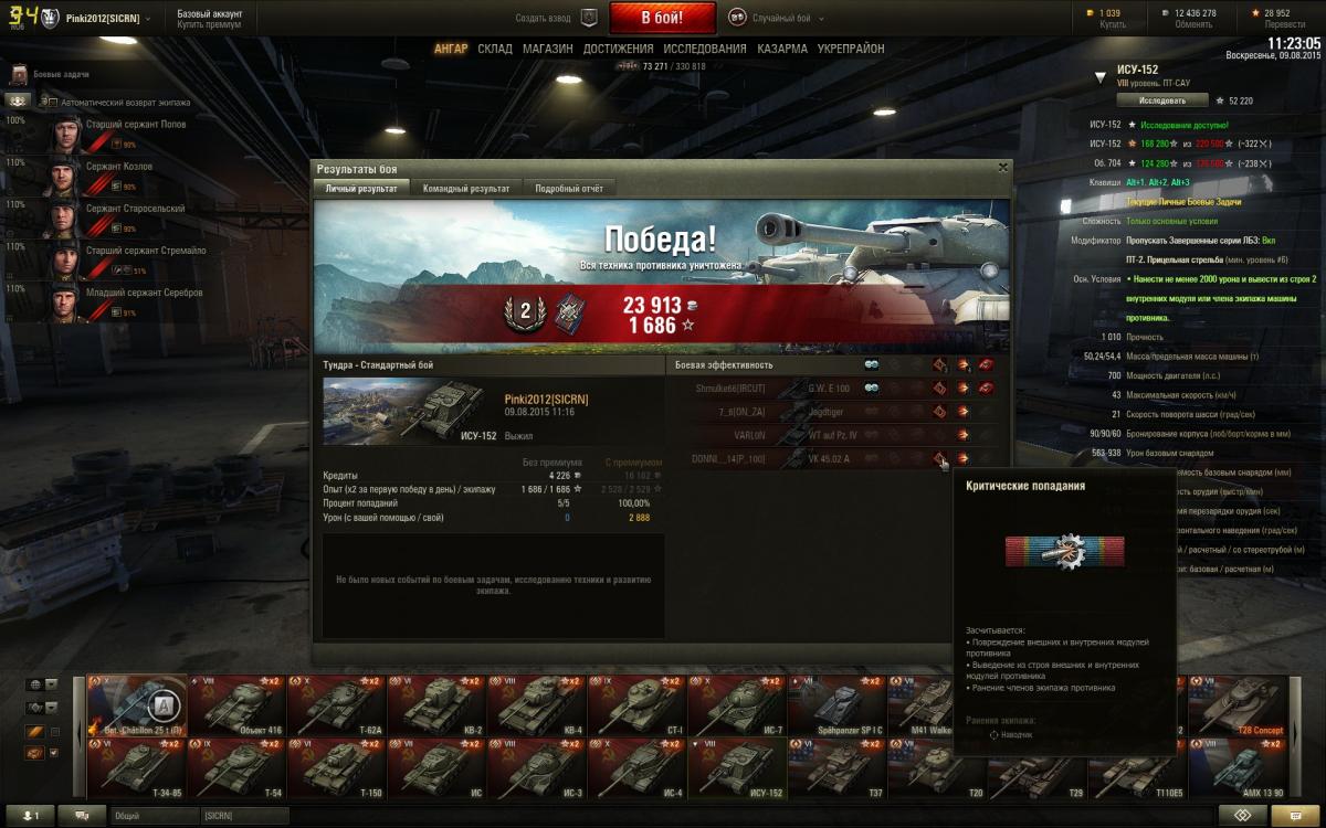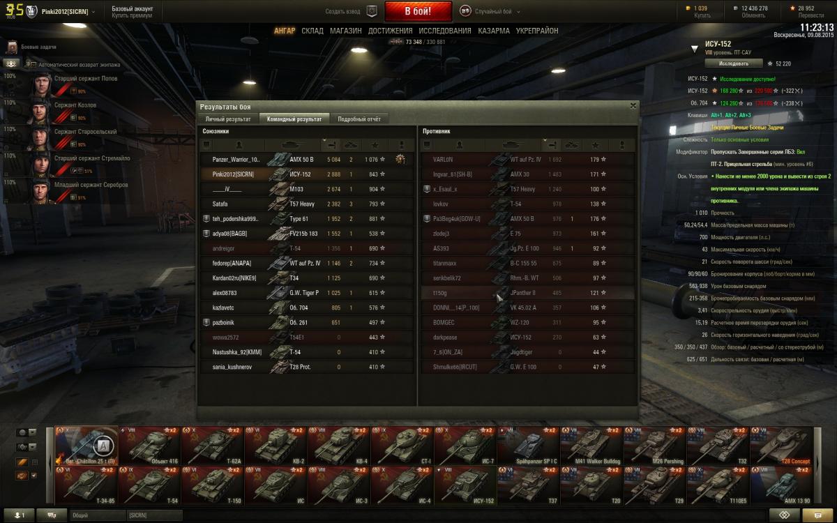 Внесу свои пять копеек. 1. Выбор засчитаной задачи. Обратил внимание какой хаос начал твориться в рандоме после введения ибз. Тяжи прут как бараны на захват с начала боя. Светляки убиваются на перегонки в первые минуты боя чтобы засветить побыстрее нужное количество танков. Кто-то откровенно сливается, т.к. нельзя выполнить нужную ИБЗ при данном раскладе. Вакханалия! Этого можно было бы избежать, ну или уменьшить негатив если бы человеку не надо было думать над конкретно ИБЗ. Если понятно что не убить за бой 3 арты, т.к. она всего одна, то играй дальше, не сливайся, зачтётся другая задача. Люди будут стараться играть хорошо, т.к. есть шанс выполнить хоть какую ИБЗ. 2. Заменить фраги на нанесённый урон или количество результативных выстрелов. Упёрся в задачу убить 2 ст. Очень часто не мог набрать фраг из-за любимых союзников. В одиночку разбирал ст, оставалось сделать 1 выстрел, как подлетал герой и забирал шота. И таких случаев крысятничества не счесть. На мой взгляд фраги очень слабый показатель мастерства. 3. Добавить к конечной сумме ТТ15 оставшиеся хп. Ну это так, желание упрощения задачи)