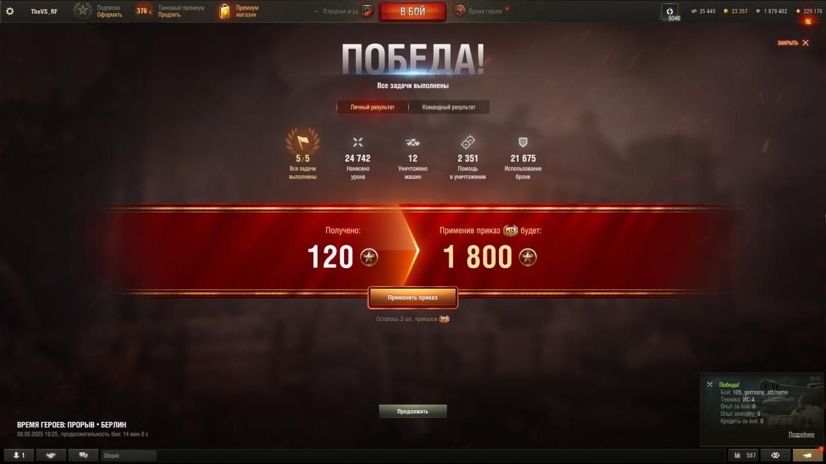 Пройдя наступление окончательно убедился, что режим сделан исключительно для доната. На ИС-2 играть - боль и унижение, танку не хватает примерно всего, побед по ощущениям меньше 20%. Но выстрадав или задонатив на ИС-4 игра превращается в тир, в котором при малейшем довороте разве что боссы могут пробивать тебя в нлд, а всякая мелочь типа тигров и пантер часто убивается подрывом БК. На примере на скриншоте я за бой взорвал штук пять боеукладок, сильно опередив напарников по урону. Сильно прятаться за укрытиями даже не пытался, что видно по натанкованному. Разработчикам должно быть стыдно за такую работу и тем более вдвойне стыдно выдавать это за какие-то там патриотические мероприятия.