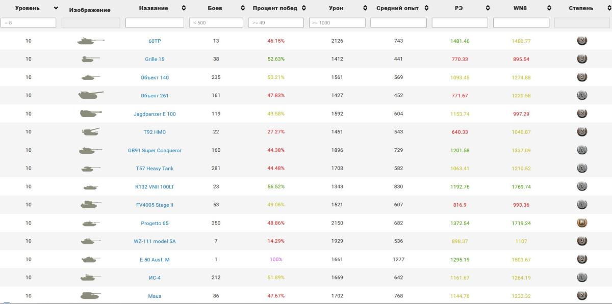 Ню-ню. А давай мы проще сделаем. Тупо сравним одинаковые танчики твои и мои, а? Не страшно? Итак! Твой STA-2 - урон - 1008, вн8 - 1267Мой STA-2 - урон - 1331, вн8 - 1730 ----------- Твой Саладин - урон - 1080, вн8 - 1405Мой Саладин - урон - 1330, вн8 - 1720 ---------- Твой М 41-90 - урон - 701, вн8 - 1208Мой М 41-90 - урон - 1044, вн8 - 2030 ---------- Твой ShPTK-TVP 100 - урон - 1341, вн8 - 1497 Мой ShPTK-TVP 100 - урон - 1639, вн8 - 1845 ---------- Твой FSV Scheme A - урон 966, вн8 - 1715Мой FSV Scheme A - урон 1144, вн8 - 1907 ------ Ниже не смотрел, но там как бы не хуже для тебя все выглядит. Но ты не бери в то, что у тебя считается головой, ты продолжай медитировать - "Это не я, это не я..."