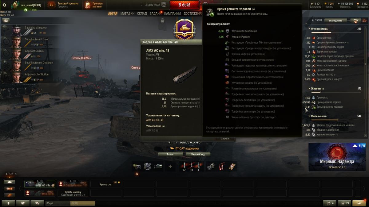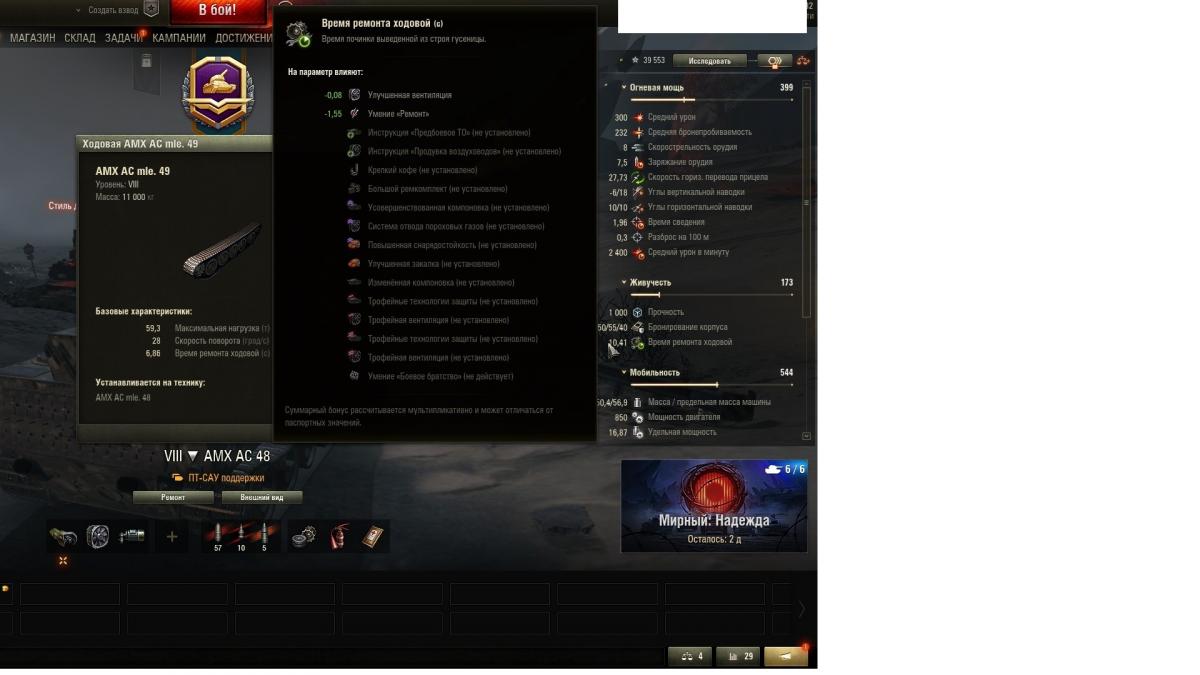 Добрый день! Разъясните пожалуйста, указанное время ремонта ходовой AMX AC mle. 48 в исследованиях указано 6,86 сек. По факту время ремонта вместе с навыками и оборудованием почему то больше 10 сек. В бою время ремонта так же более 10 сек. Или это время указывается с прокаченным ремонтом у экипажа на 100%? Но тогда, если следовать логике ремонт ходовой получится около 5 сек, но не 6,86. Скриншот из Безопасного режима прилагаю. Извиняюсь, своевременно не заметил вопрос в предыдущей теме, поэтому исправляюсь... С уважением we_smart