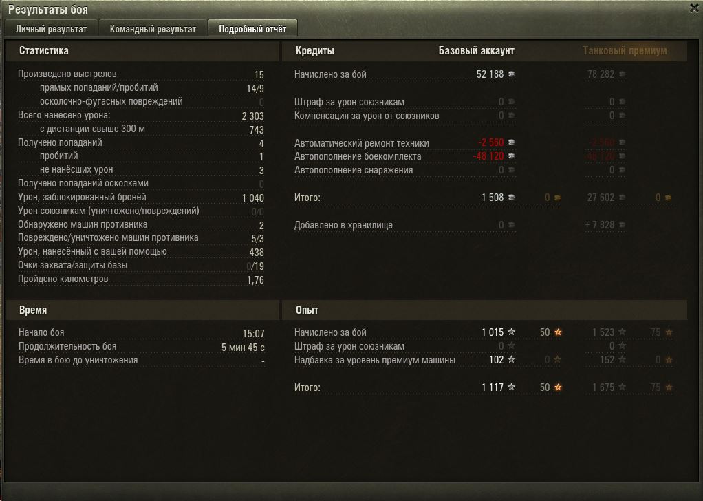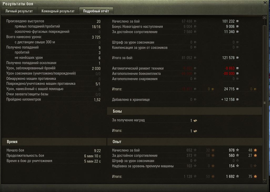 Доброго дня, танкисты! Играя на прем танке 8 уровня Somua SM, обратил внимание на "сумасшедшие" цифры за автопополнение боекомплекта. В начале боя, случайно перешел за зарядку в магазин из 5 патронов на голдовые снаряды, через секунд 5-10 это заметил и начал снова зарядку обычными ББ, т.е. не стрельнул ни разу голдой(или как начали сейчас говорить, специальными снарядами). При этом количество спец снарядов отображаемых в бою не изменилось. Проведя бой и выстрелив в нем 15 раз обычными ББ, на после боевой статистике увидел цифры в 48к серебра за снаряды, хотя по идеи должно быть 15к. Вопрос: почему учитываются не заряженные, не выстреленные(неиспользуемые) снаряды в расчете сумм автопополнения? http://cdn-frm-eu.wargaming.net/wot/ru/uploads/monthly_12_2019/post-57755-0-16458600-1575977331_thumb.jpg http://cdn-frm-eu.wargaming.net/wot/ru/uploads/monthly_12_2019/post-57755-0-18252600-1575977348_thumb.jpg Реплей : http://wotreplays.ru/site/12546603#tundra-waters-somua_sm