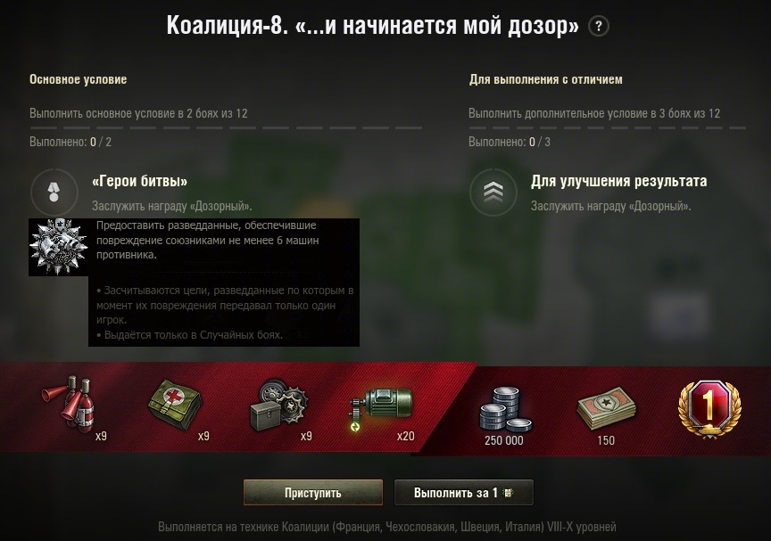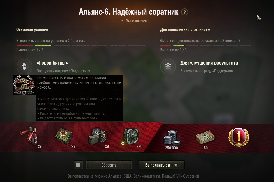 Потому что не всегда помнишь/знаешь все условия для получения медали. (Скриншоты как пример для наглядности). И вести учет выполнения условий для получения медали в бою. То есть, прогресс выполнения в бою для основного калибра - 15% нанесенного урона из из 20%, для поддержки - 3из6 и т.д.