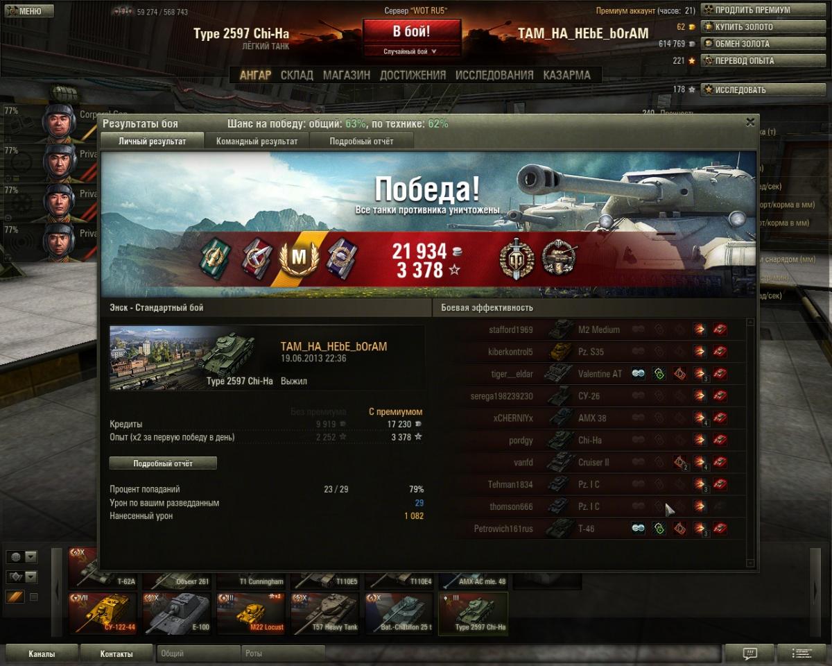 Зло танк,мой первый и последний бой т.к. хватило опыта на 4ур.Победа Энск 19 июня 2013 г. 22:36:29 Type 2597 Chi-Ha Получено опыта: 3 378 (x2) Получено кредитов 21 934 Достижения в бою: «Воин», «Стрелок», «Коса Смерти», «Бронебойщик», «Невозмутимый», Знак класcности «Мастер» Итого: 21 934