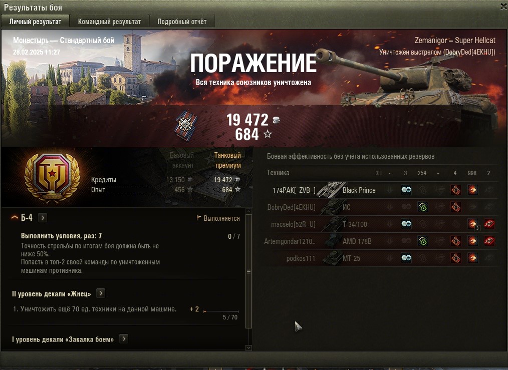 https://forum-mt-prod.lesta.ru/monthly_02_2025/post-58471993-0-40063800-1740732435_thumb.jpg https://forum-mt-prod.lesta.ru/monthly_02_2025/post-58471993-0-17086100-1740733365_thumb.jpg Не понятно почему не выполнил задачу??? Задача Б-4 1. - Попасть в топ-2 своей команды по уничтоженным машинам противника. 2. - Точность стрельбы по итогам боя должна быть не ниже 50%. В бою уничтожил 2 машины. Такое же количество (2 фрага) сделали еще 3 союзника. Больше 2 фрагов не сделал никто. Из набивших по 2 фрага я занял 4 место по опыту. Получается я попал в топ-1 по уничтоженной технике, точность стрельбы составила 12 выстрелов - 8 попаданий и 6 пробитий = более 50 % Есть какое-то скрытое условие? То есть надо еще и по опыту быть вторым из топ 2 по фрагам????? Или нельзя быть топ-1 а только топ 2 по фрагам??? Реплей : http://cdn-frm-ru.lesta.ru/4.6l/style_extra/mime_types/win_player.gif 20250228_1127_usa-A130_Super_Hellcat_19_monastery.wotreplay 1,27МБ Второй бой засчитало https://forum-mt-prod.lesta.ru/monthly_02_2025/post-58471993-0-78225800-1740733425_thumb.jpg По всей видимости действительно при равенстве фрагов ты должен быть не менее чем вторым по опыту среди них. В подтверждение предположения: https://forum-mt-prod.lesta.ru/monthly_02_2025/post-58471993-0-92172700-1740737067_thumb.jpg Этот бой засчитало, хотя 2 фрага сделал последним. Модератор, скомпоновал все в одно сообщение - все что ниже можно попросить удалить, чтобы не разводить воды много, а то Симпсон налил там....всякого!