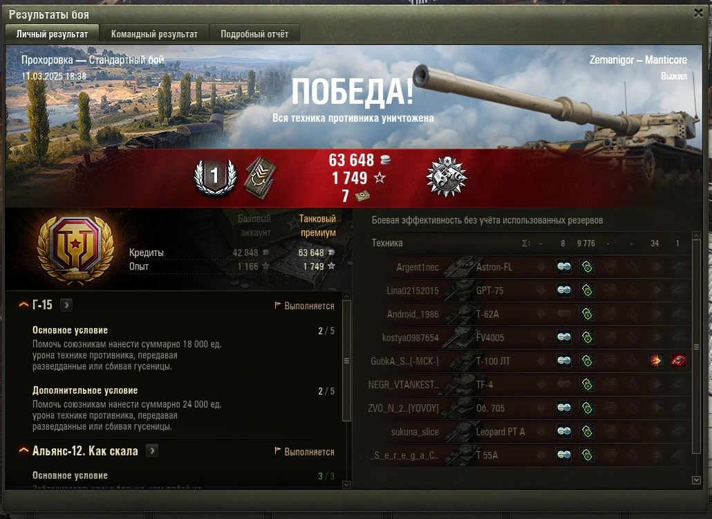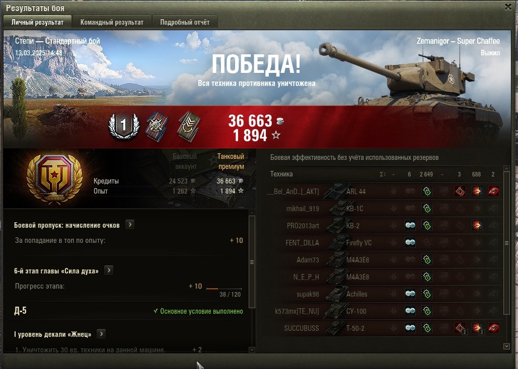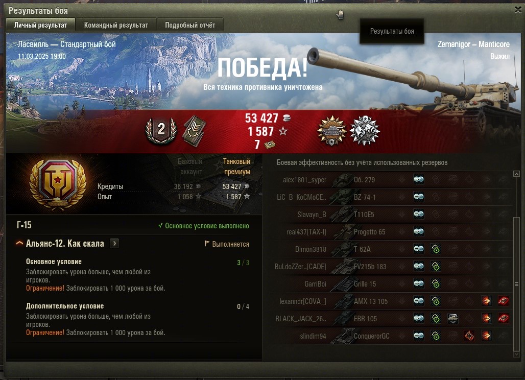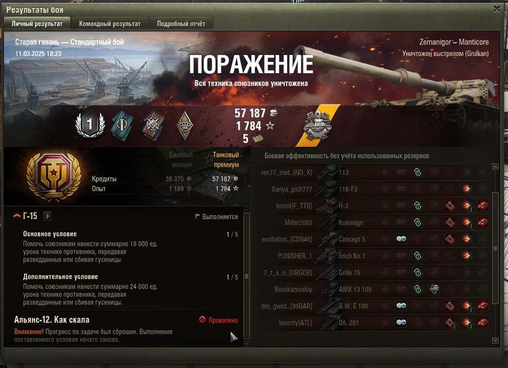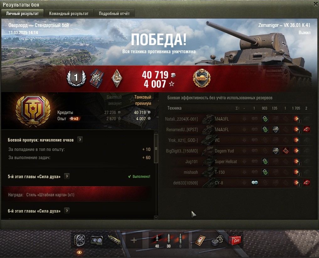 Все основные задачи выполнены и приступил к финальным 5-м задачам. Первой выполнил Г-15 (без отличия). Насветить на 18 000 урония. Играл на Мантикоре и выполнил фактически за 4 боя, в 5 бою пытался выполнить на отлично (24 000 насвета), но не повезло. Итого: https://forum-mt-prod.lesta.ru/monthly_03_2025/post-58471993-0-27334100-1741710926_thumb.jpg https://forum-mt-prod.lesta.ru/monthly_03_2025/post-58471993-0-29793700-1741710932_thumb.jpg https://forum-mt-prod.lesta.ru/monthly_03_2025/post-58471993-0-25794000-1741710937_thumb.jpg Старая гавань - 2430 https://forum-mt-prod.lesta.ru/monthly_03_2025/post-58471993-0-10539700-1741710944_thumb.jpg https://forum-mt-prod.lesta.ru/monthly_03_2025/post-58471993-0-61748900-1741710952_thumb.jpg https://forum-mt-prod.lesta.ru/monthly_03_2025/post-58471993-0-14524600-1741710958_thumb.jpg Прохоровка - 9776 (12 206) https://forum-mt-prod.lesta.ru/monthly_03_2025/post-58471993-0-68880200-1741710963_thumb.jpg https://forum-mt-prod.lesta.ru/monthly_03_2025/post-58471993-0-07924300-1741710975_thumb.jpg https://forum-mt-prod.lesta.ru/monthly_03_2025/post-58471993-0-36846700-1741710979_thumb.jpg Затерянный город - 520 (12 726) https://forum-mt-prod.lesta.ru/monthly_03_2025/post-58471993-0-71574700-1741710985_thumb.jpg https://forum-mt-prod.lesta.ru/monthly_03_2025/post-58471993-0-06625900-1741710992_thumb.jpg https://forum-mt-prod.lesta.ru/monthly_03_2025/post-58471993-0-06028800-1741710997_thumb.jpg Ласвиль - 5977 (18 653)