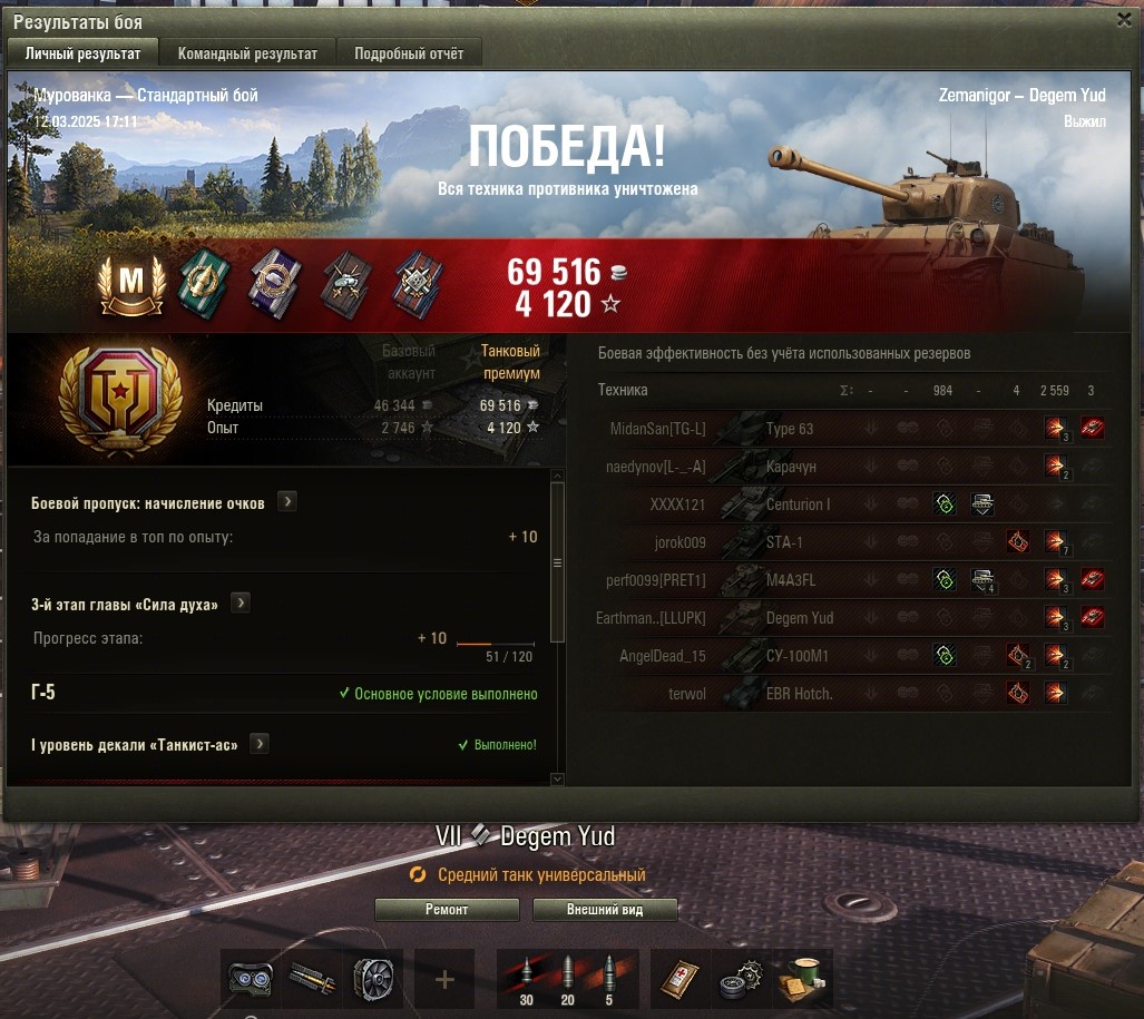 Задача Г-5 (нанести 2500 урона) выполнена, хоть и не на отлично. После обновы появилась новая ветка и вот на 7 уровне, на еврейском Шермане, с 8-ками получилось настрелять... https://forum-mt-prod.lesta.ru/monthly_03_2025/post-58471993-0-59203400-1741789956_thumb.jpg https://forum-mt-prod.lesta.ru/monthly_03_2025/post-58471993-0-03970300-1741789961_thumb.jpg https://forum-mt-prod.lesta.ru/monthly_03_2025/post-58471993-0-39985900-1741789965_thumb.jpg
