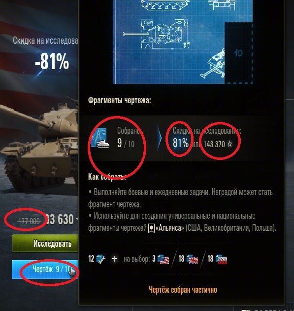4. Добрый день, Уважаемое сообщество «Мир Танков»! Объясните мне, пожалуйста, как перечисляется опыт исследования танков при наличии определенного колличества чертежей. Пример: Т49, собрано чертежей 9 из 10, скидка на исследование 81%, опыта для исследования необходимо 33630, при этом для полного исследование Т49 необходимо 177000 опыта. Где, чего и как я неправильно считаю?