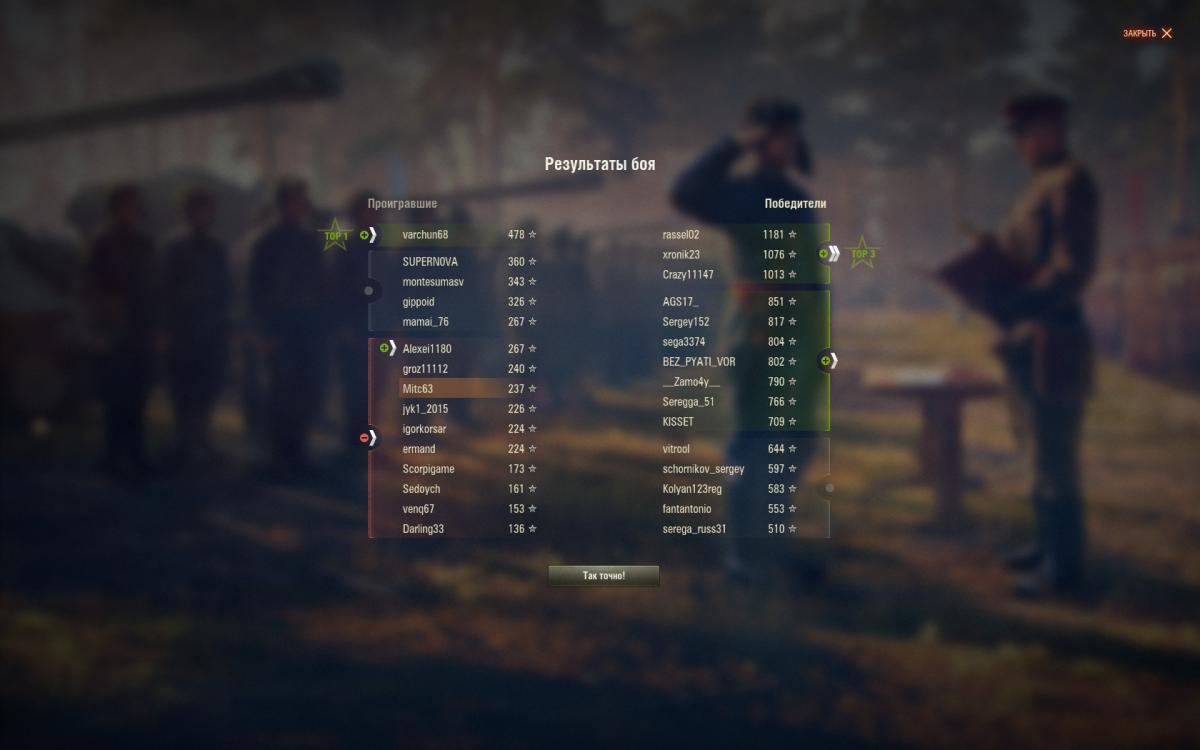 Вопрос такой , почему нельзя сделать чтобы игрок мог достойно проигрывать ? Сделайте кредиты и опыт проигравшей стороне такой же как и победившим, или варианты 5 проигравшим и 10 победившим , Сделайте пару медалей за оборону проигравшей команде , и уберите статистику выигрышей , оставьте по урону и попаданиям, ведь они не зависят от победы каманды, Для чего , да для того что не могут быть все довольные только от побед ,вы сейчас балансировщик трясёте , но будет тоже самое , будут недовольные .а бои сами по себе сбалансированы сейчас, А сейчас невозможно играть балансировщик в резонанс входит ,10 подряд побед , потом столько же поражений ,10 побед стерпеть можно ,а 10 поражений как то не очень , вернее то что стата падает ,опыт не идёт ,хотя часто на верхних строчках , да и интересу больше в конце когда против всех 1 остался. Но стата.... спасибо за внимание.