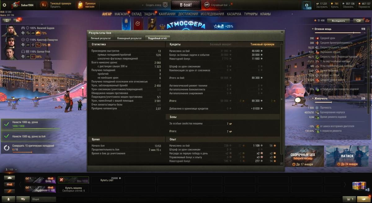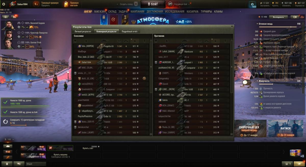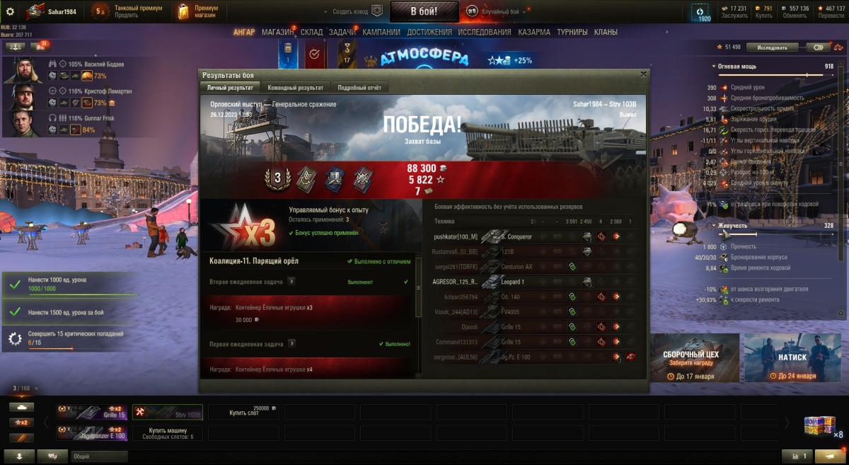 Нежданчиком выполнена 11 задача на ПТ Strv 103B ) Собирался вообще 4500 урона за бой нанести для сборочного цеха, а тут хоп. Болталась предпоследняя не выполненная задача в коалиции. И она меня уже как бы подутомила. Прокачал уже все французские лт, а всё никак. Насветить без проблем, а вот при этом еще нужный урон нанести не получалось. И как то уже подзабил на задачу эту - и вот нежданчик. Ну тут ещё повезло, что генеральное сражение, в обычном бы наверное так не получилось, поэтому выкладываю ни как рекомендацию к прохождению, а просто как интересный факт.