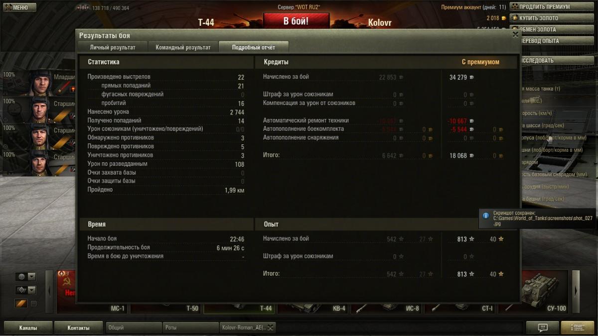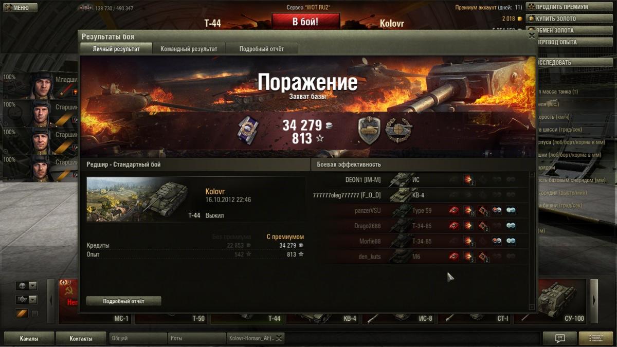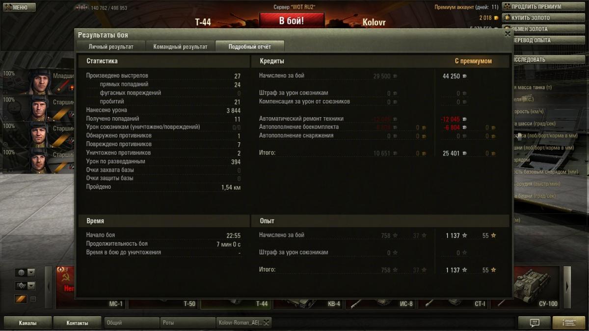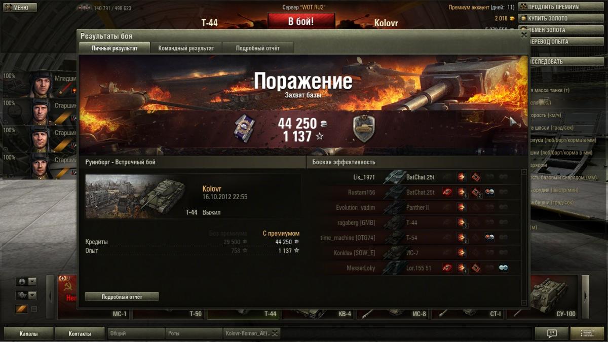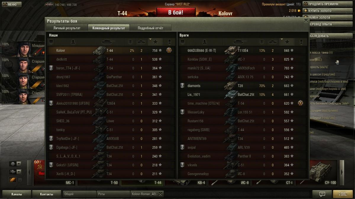 Вчера был офигенный вечер... Хочу поделиться эмоциями. Поскольку идет акция на скидку на т54 - решил за эти дни постараться успеть добить опыта и купить со скидкой в миллион (на дороге-то не валяется) и начал качаться на т44....... Первое поражение, второе...... шестое.... восьмое... Восемь поражений подряд! Куча нервов, мата со моей стороны.... Не припомню такой серии у себя... (Справедливости ради скажу, что среди них вроде бы не было сливов.... а были все-таки боевые поражения). Но я решил продолжить во что бы-то ни стало, собрал волю в кулак и сделал захватчика в одном бою со счетом 14-14.... Дальше была ничья и затем шесть!!! побед подряд.... (думаю было бы больше, но пошел спать - с утра на работу). В общем - забавно было.... З.ы. среди восьми поражений были вот такие два забавных (подряд):