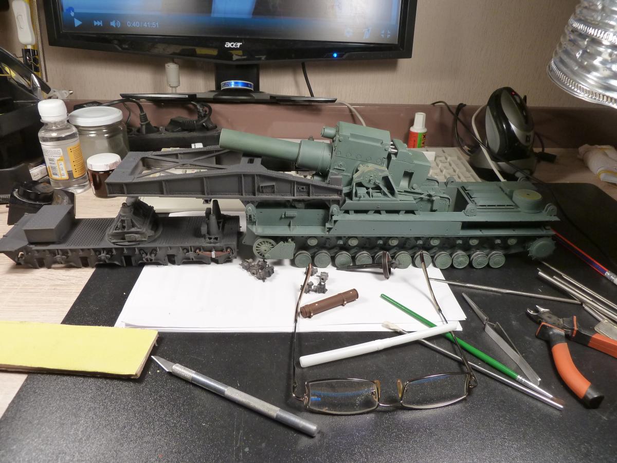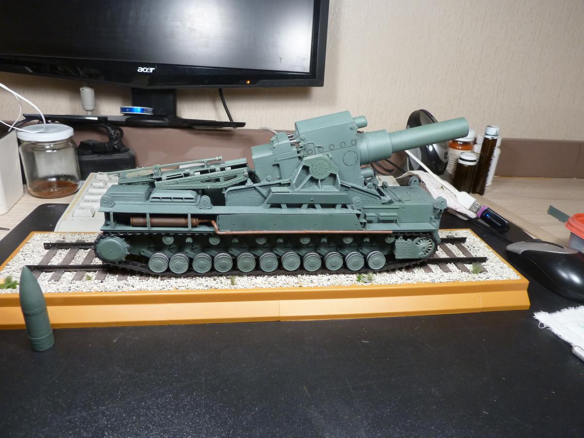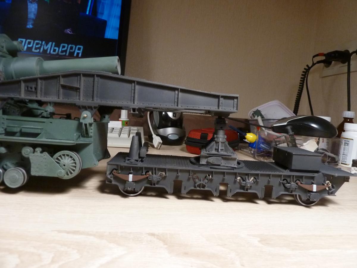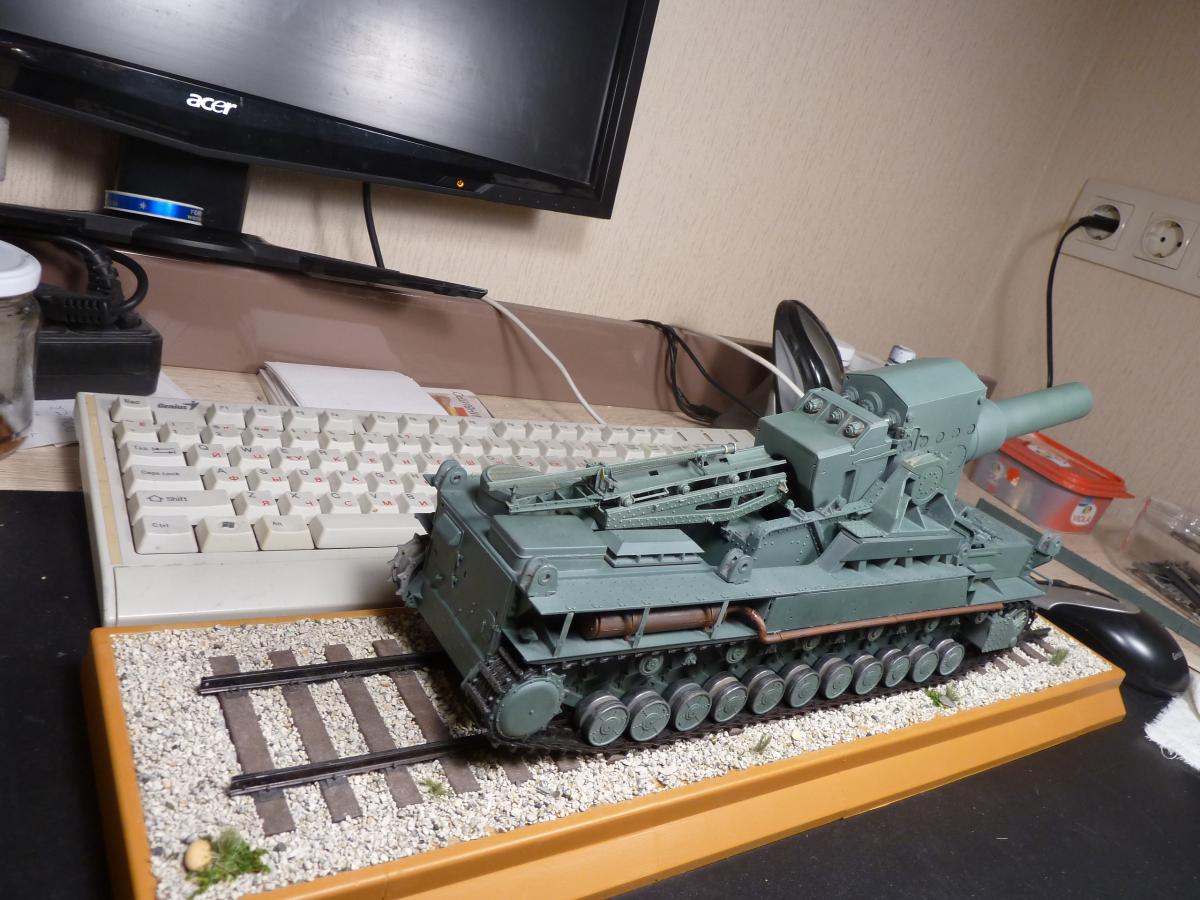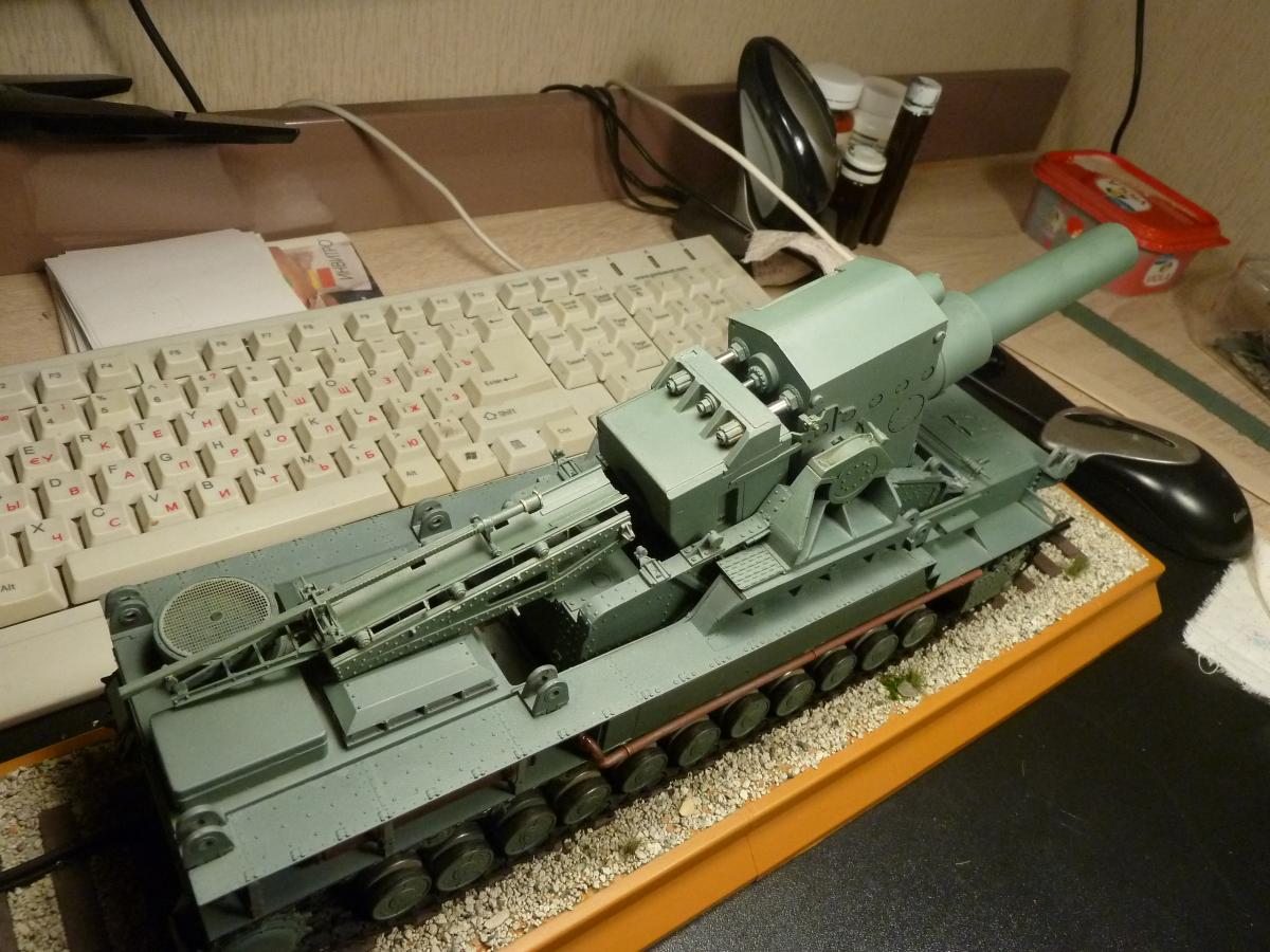 В выходные решил покрасить модель. Грунтовал из балончика, очень удобно, быстро, но расход ужасный половина мимо. Красить решил аэрографом, опыта ни какого. Намучился с ним, то плюёт, то еле-еле пылит. Вообщем с горем попалам покрасил. Базовый цвет сделал из четырёх красок. Чёрный, серый, голубой и зелёный. Долго всё перемешивал, пока не понравилось. Чтобы точно цвет передать сделал восемь снимков и только один кадр получился. Покрасить получилось только мортиру, а потом что-то случилось аэрографом. Начал железнодорожные платформы собирать.