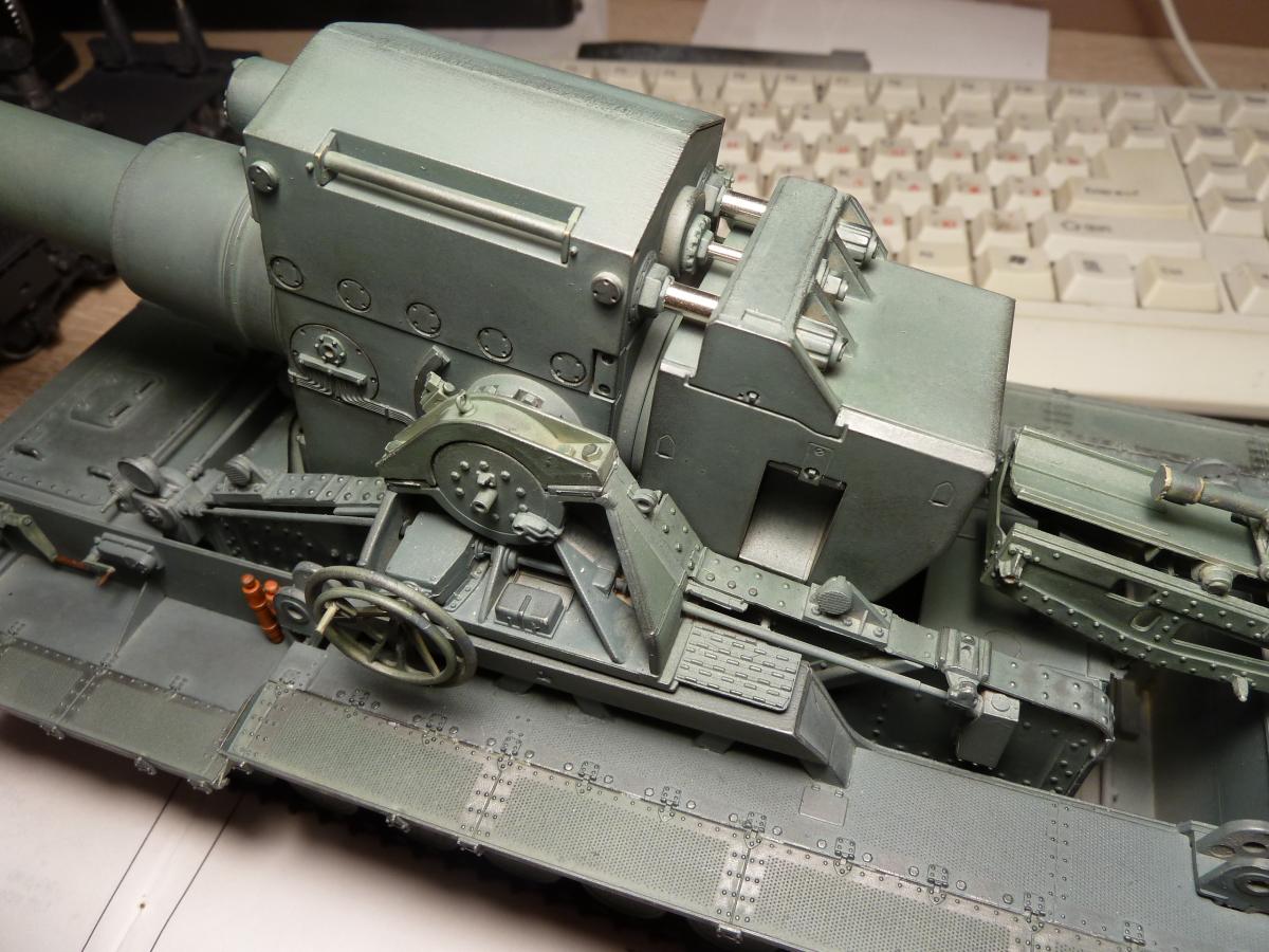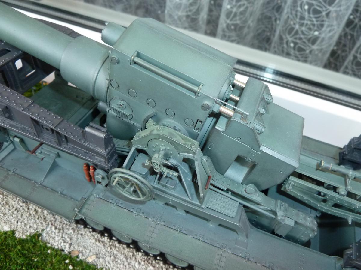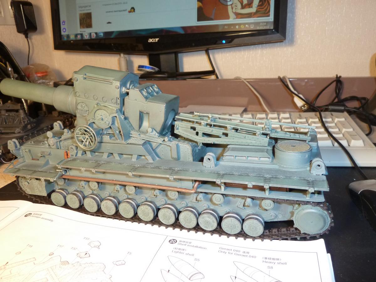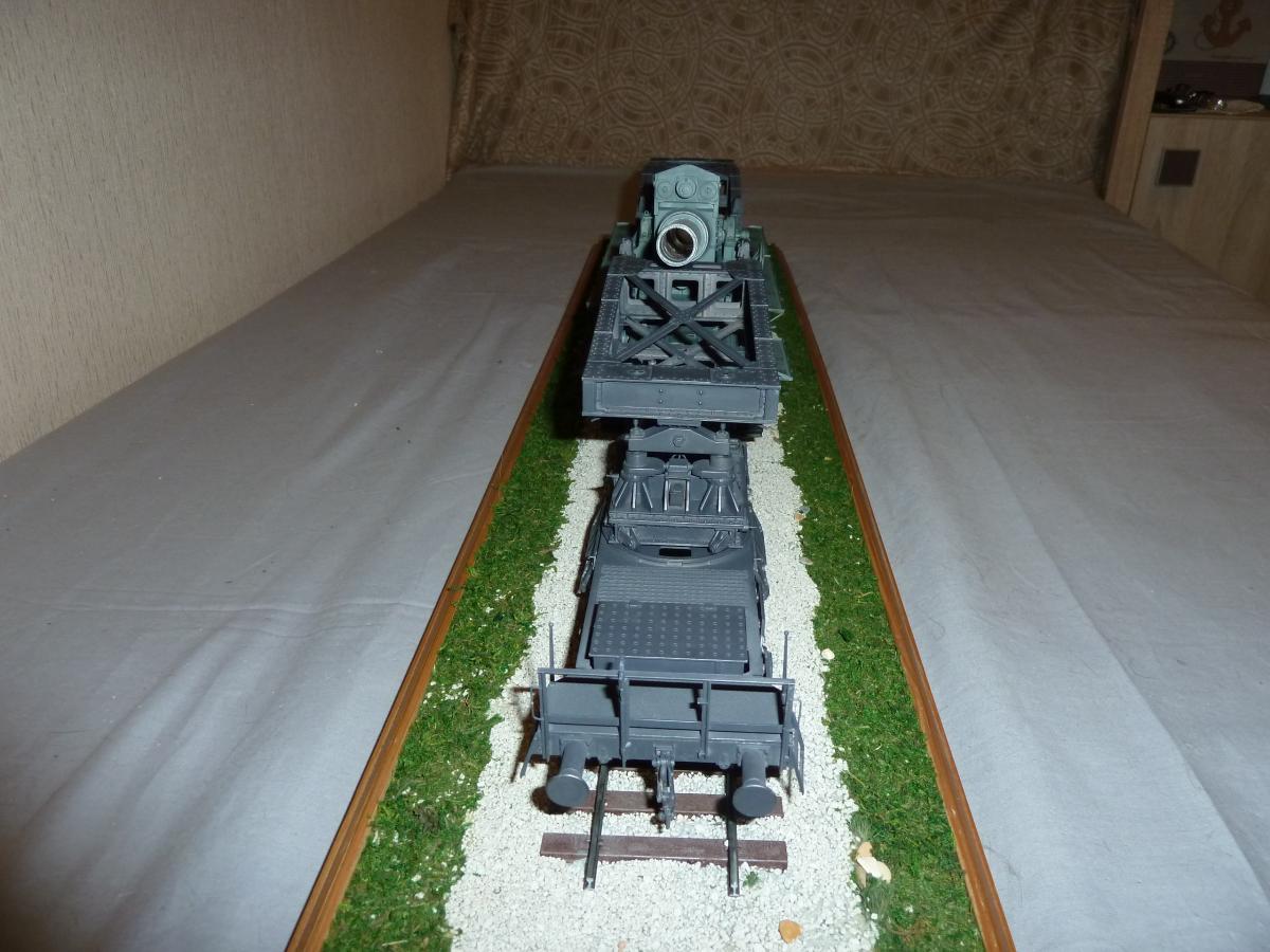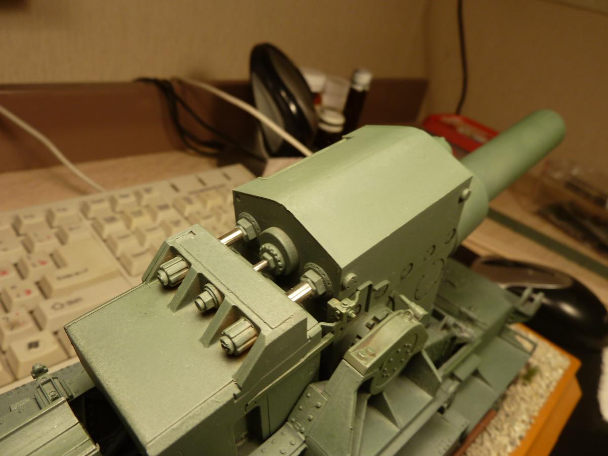 В выходные решил покрасить модель. Грунтовал из балончика, очень удобно, быстро, но расход ужасный половина мимо. Красить решил аэрографом, опыта ни какого. Намучился с ним, то плюёт, то еле-еле пылит. Вообщем с горем попалам покрасил. Базовый цвет сделал из четырёх красок. Чёрный, серый, голубой и зелёный. Долго всё перемешивал, пока не понравилось. Чтобы точно цвет передать сделал восемь снимков и только один кадр получился. Покрасить получилось только мортиру, а потом что-то случилось аэрографом. Начал железнодорожные платформы собирать.