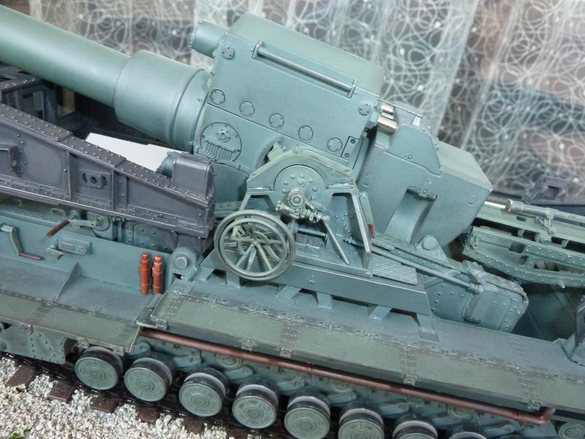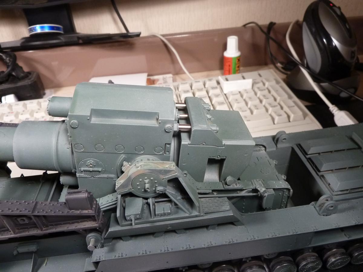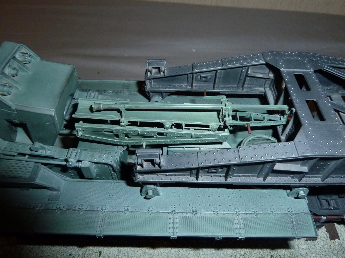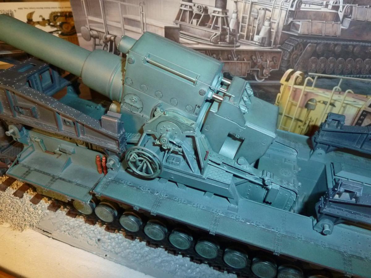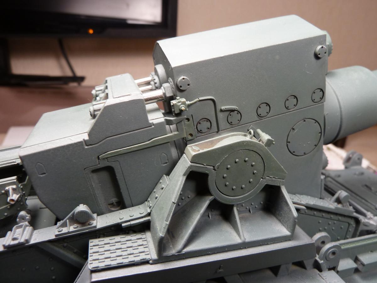 В выходные решил покрасить модель. Грунтовал из балончика, очень удобно, быстро, но расход ужасный половина мимо. Красить решил аэрографом, опыта ни какого. Намучился с ним, то плюёт, то еле-еле пылит. Вообщем с горем попалам покрасил. Базовый цвет сделал из четырёх красок. Чёрный, серый, голубой и зелёный. Долго всё перемешивал, пока не понравилось. Чтобы точно цвет передать сделал восемь снимков и только один кадр получился. Покрасить получилось только мортиру, а потом что-то случилось аэрографом. Начал железнодорожные платформы собирать.