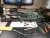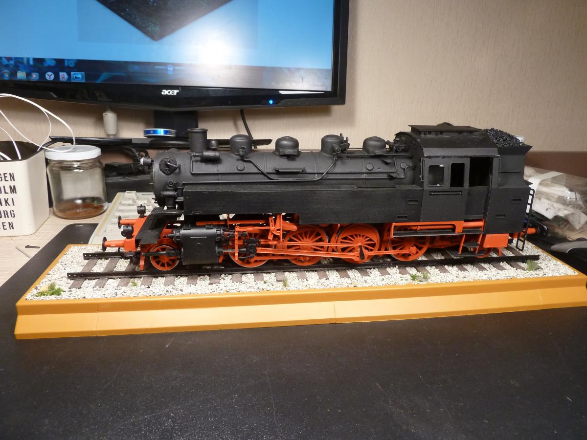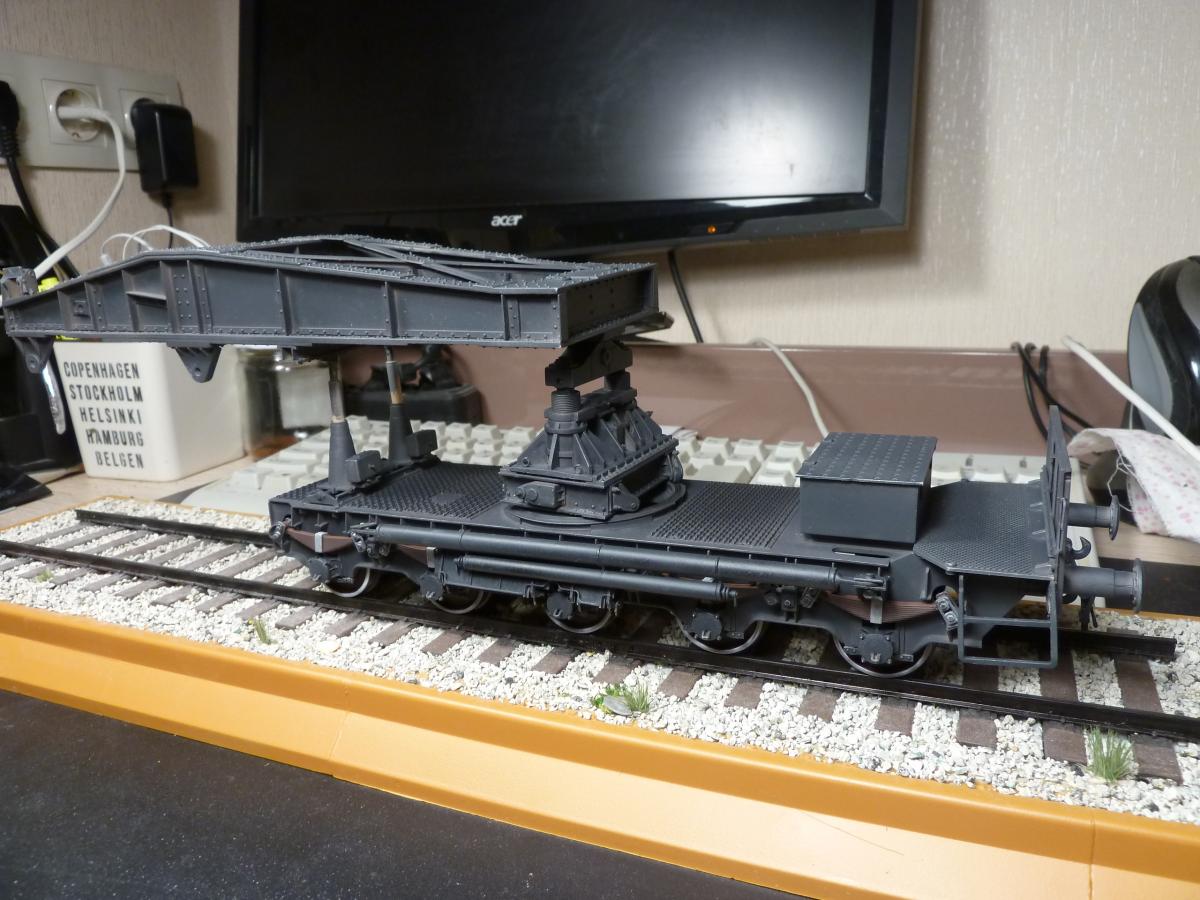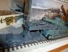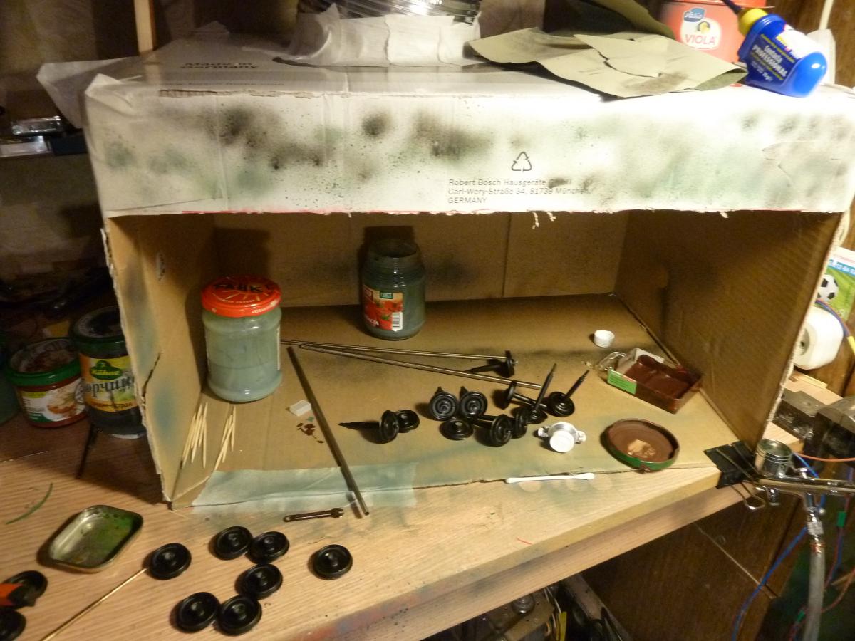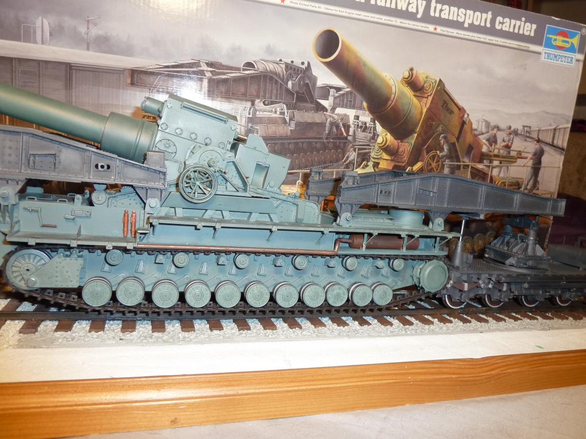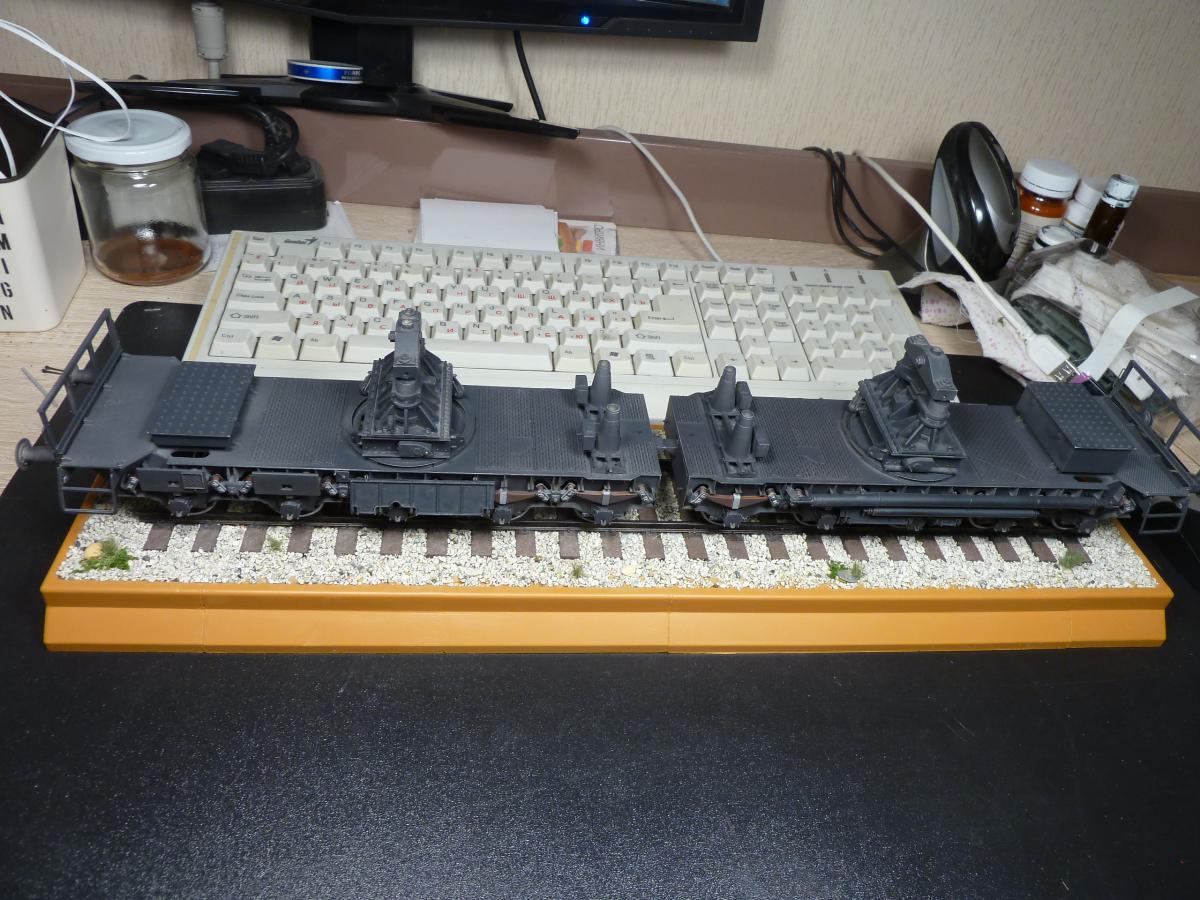 В выходные решил покрасить модель. Грунтовал из балончика, очень удобно, быстро, но расход ужасный половина мимо. Красить решил аэрографом, опыта ни какого. Намучился с ним, то плюёт, то еле-еле пылит. Вообщем с горем попалам покрасил. Базовый цвет сделал из четырёх красок. Чёрный, серый, голубой и зелёный. Долго всё перемешивал, пока не понравилось. Чтобы точно цвет передать сделал восемь снимков и только один кадр получился. Покрасить получилось только мортиру, а потом что-то случилось аэрографом. Начал железнодорожные платформы собирать.