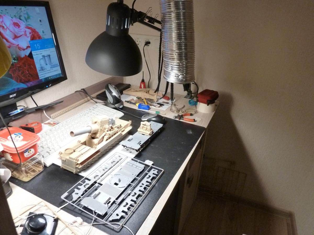 Решил покрасить собранные детали, но краска, которую сам сделал из трёх акриловых красок чёрная, серая и голубая на детали вообще не ложилась, а собиралась каплями. Хотя я очень хорошо обезжирил хорошим средством. Купил акриловый грунт покрыл склееные детали им. Грунт на делях держится крепко. Проверял малярной лентой. Краской пока не красил, но думаю на грунт краска ляжет хорошо. Жена начала потихоньку наезжать, что пахнет сильно клеем. Я и сам понимал, что клей сильно пахнет. Хотя пользуюсь клеем Revell, очень удобно им пользоваться. Правда носик иногда забивается, у меня есть сверло 0,3 мм. им я быстро прочищаю кончик. Решил пойти на встречу жене и себе и сделал вытяжку за 30 минут и по цене в 350 рублей. Работает вытяжка просто отлично.
