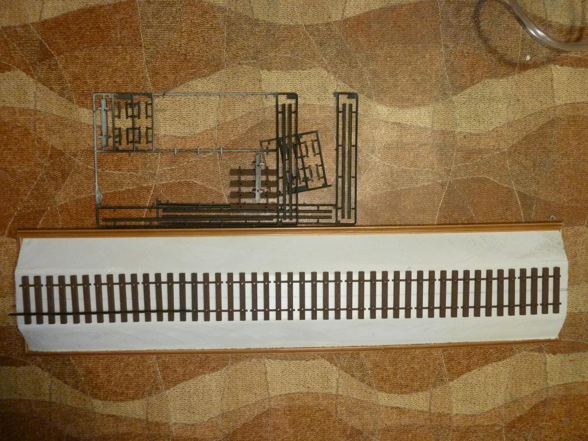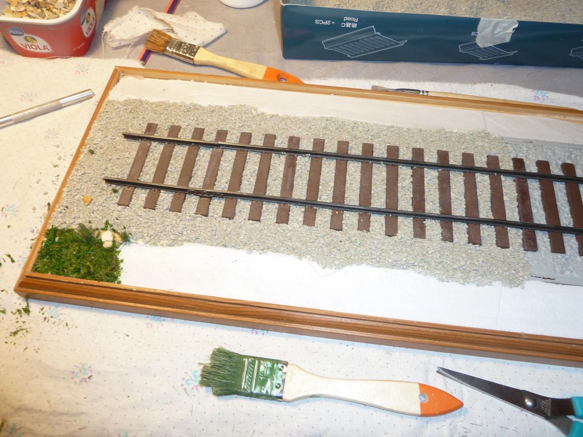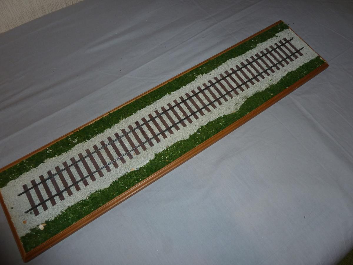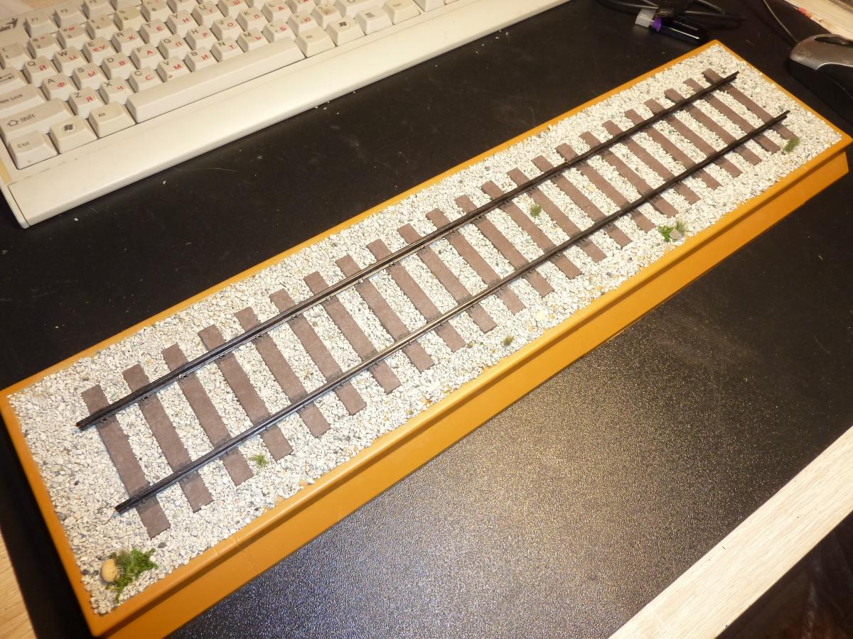 В выходные был на даче. Решил модель свою перекрасить. Цвет в который покрасил, какой-то не естественный. Красить могу только на даче. Там у меня сделан покрасочный бокс с вытяжкой, из коробки для пылесоса. В общем аэрограф у меня красить отказался, хотя на той неделе красил нормально. Что я только с ним не делал, красить он не захотел. И интернет читал, и чистил и краску разводил. Чтоб простоя не было, решил сделать насыпь для рельс. Шпалы и рельсы покрасил кисточкой, если поверхность ровная то аккуратно кисточкой можно покрасить. Подложку сделал из ДСП, насыть из пенопласта. А щебёнку решил сделать из кошачего наполнителя, очень похож на щебёнку и размером тоже.