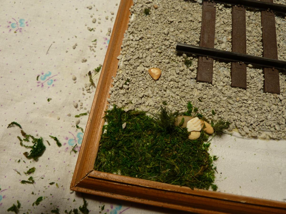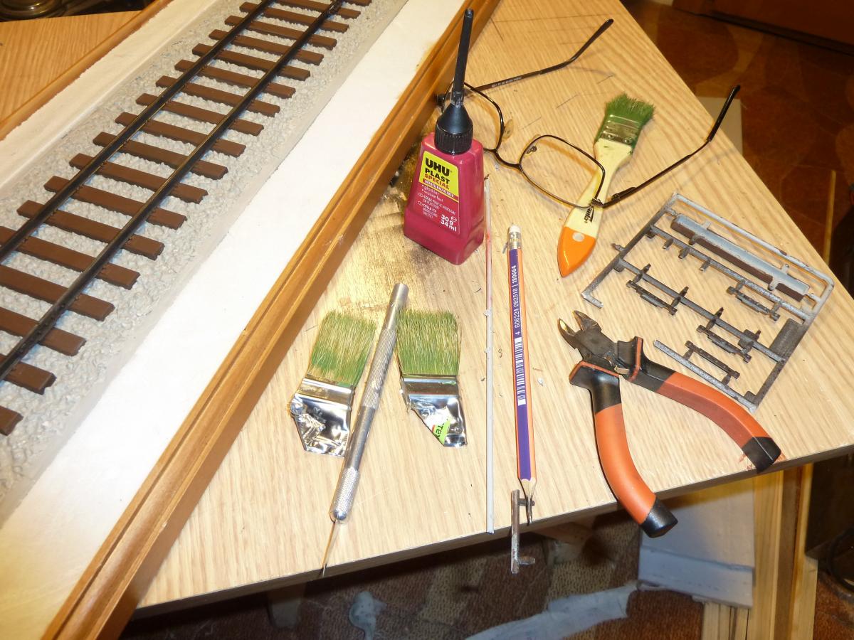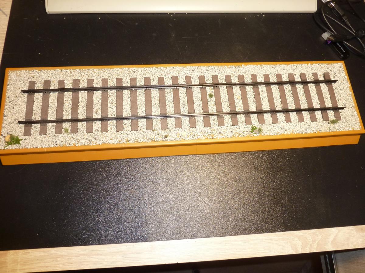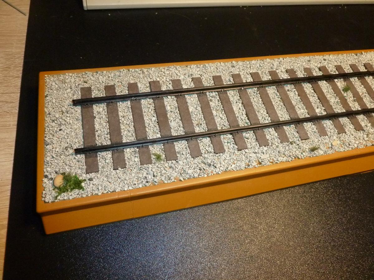 В выходные был на даче. Решил модель свою перекрасить. Цвет в который покрасил, какой-то не естественный. Красить могу только на даче. Там у меня сделан покрасочный бокс с вытяжкой, из коробки для пылесоса. В общем аэрограф у меня красить отказался, хотя на той неделе красил нормально. Что я только с ним не делал, красить он не захотел. И интернет читал, и чистил и краску разводил. Чтоб простоя не было, решил сделать насыпь для рельс. Шпалы и рельсы покрасил кисточкой, если поверхность ровная то аккуратно кисточкой можно покрасить. Подложку сделал из ДСП, насыть из пенопласта. А щебёнку решил сделать из кошачего наполнителя, очень похож на щебёнку и размером тоже.