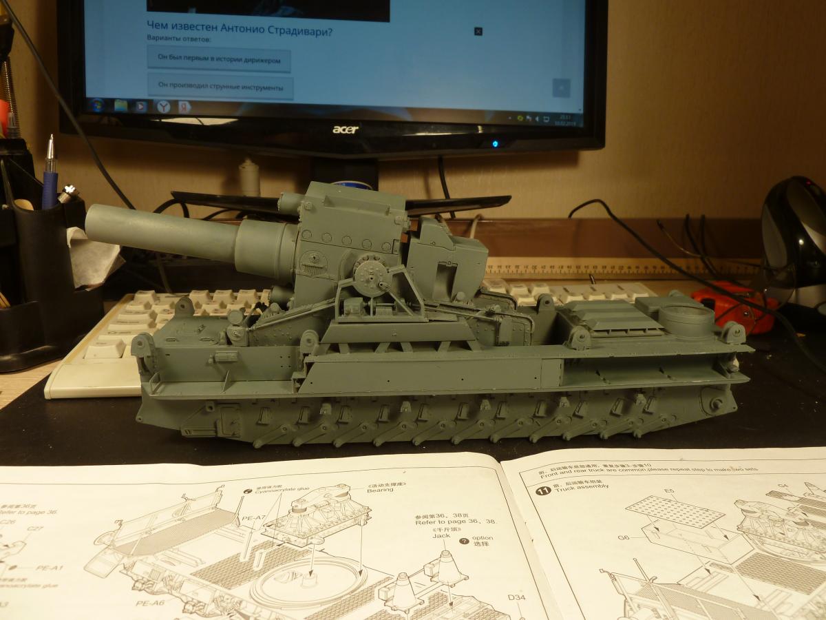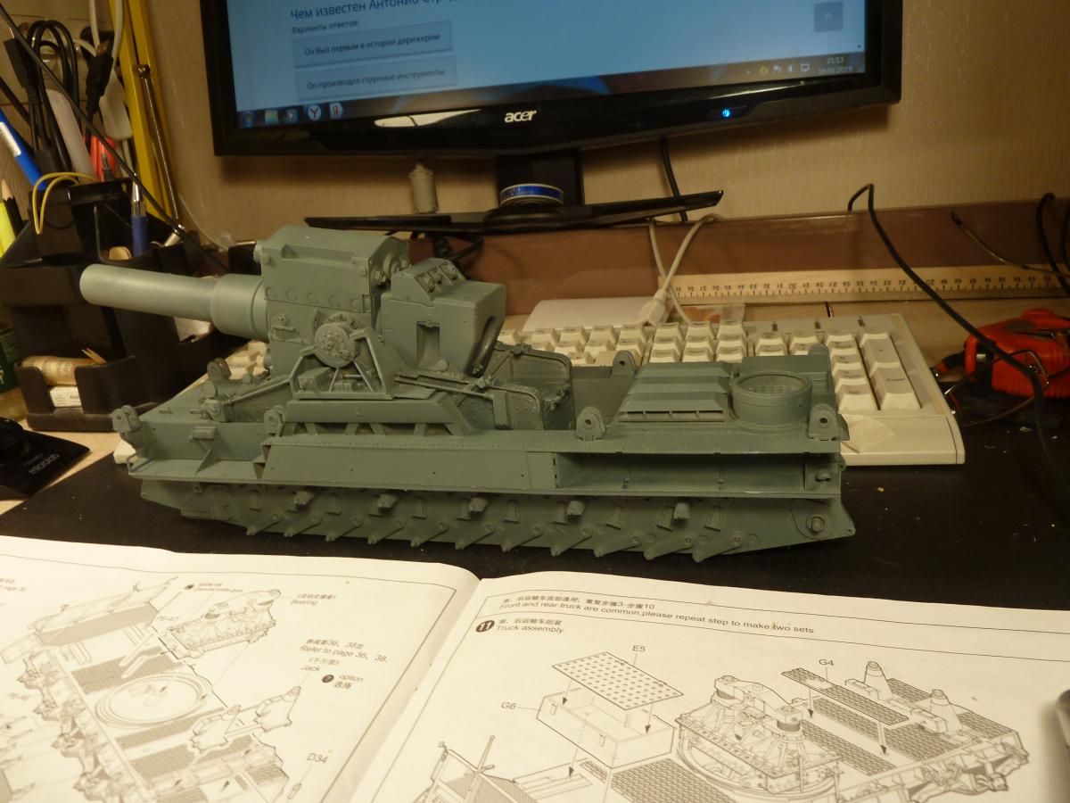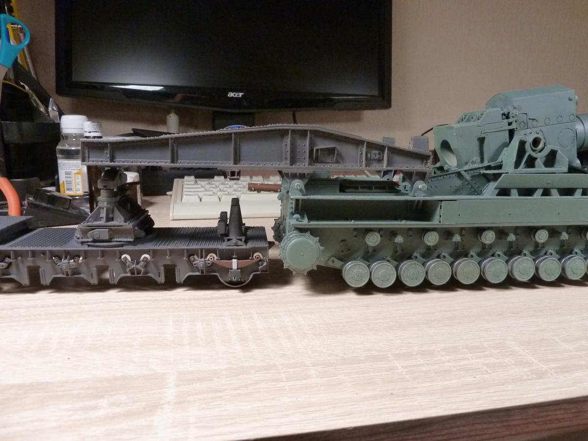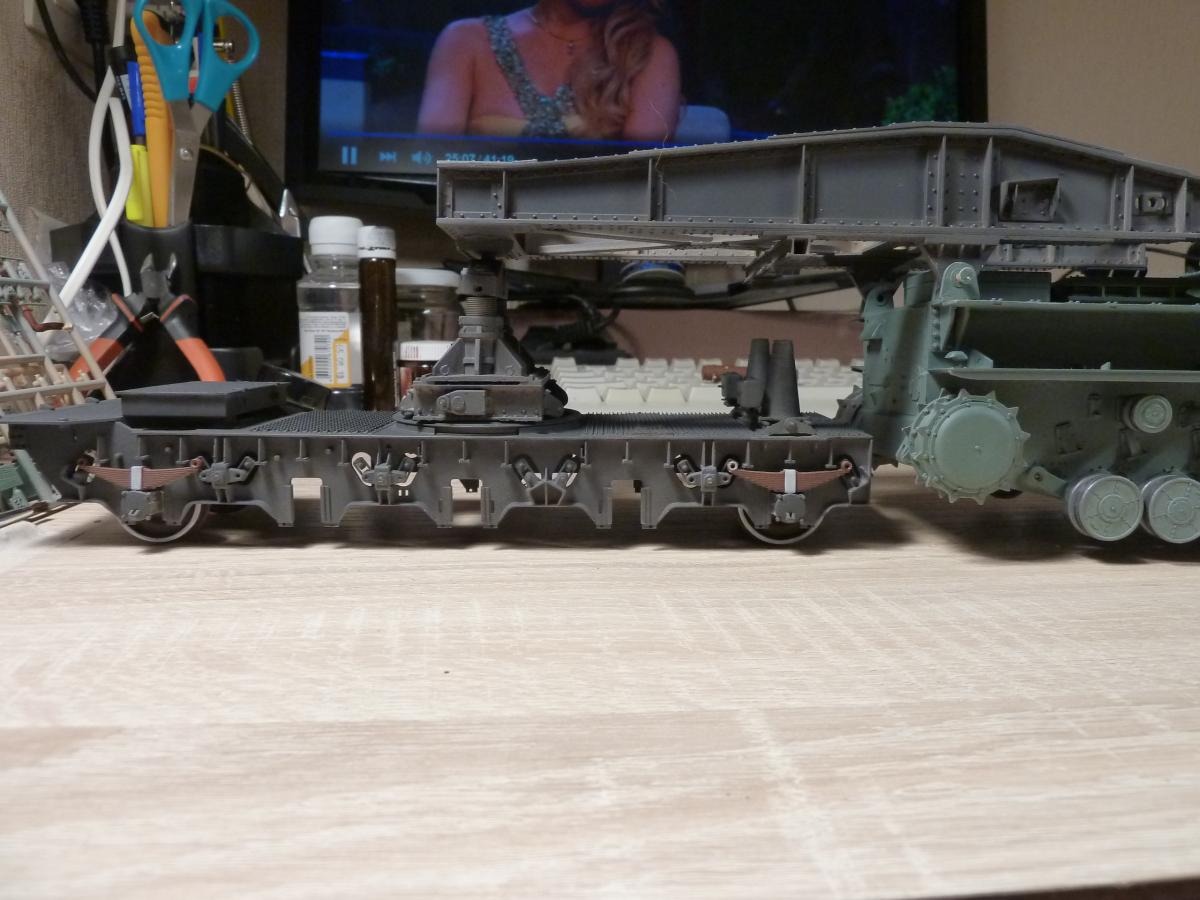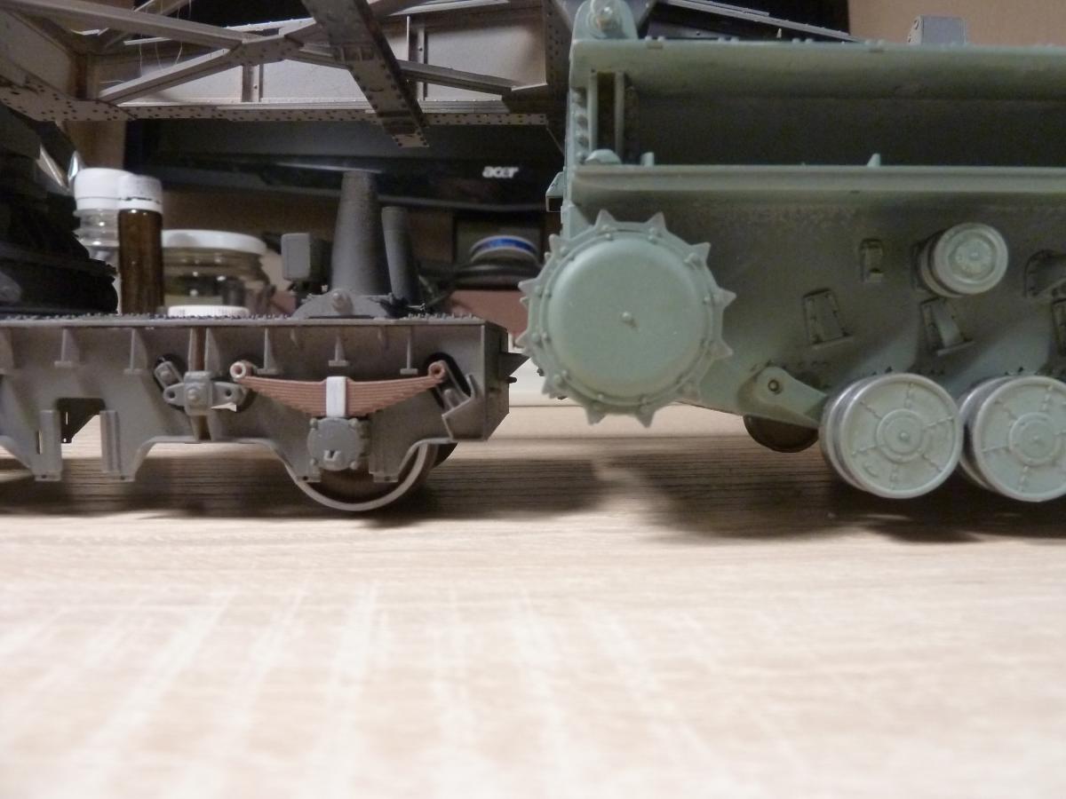 Меня тут сомнения посетили. Модель можно собрать в двух положениях. В походном ,когда её везут на ж/д платформах и когда она сама передвигается. В походном положении у неё катки поджаты, но смотрится как-то не очень (моё мнение). Ну и склеил я её, когда катки опущены,т.е. когда она двигается. И вдруг мне стукнуло в голову, а вдруг катки рельс будут касаться. Собрал на скорую руку всё на соплях, вроде нет, всё нормально.