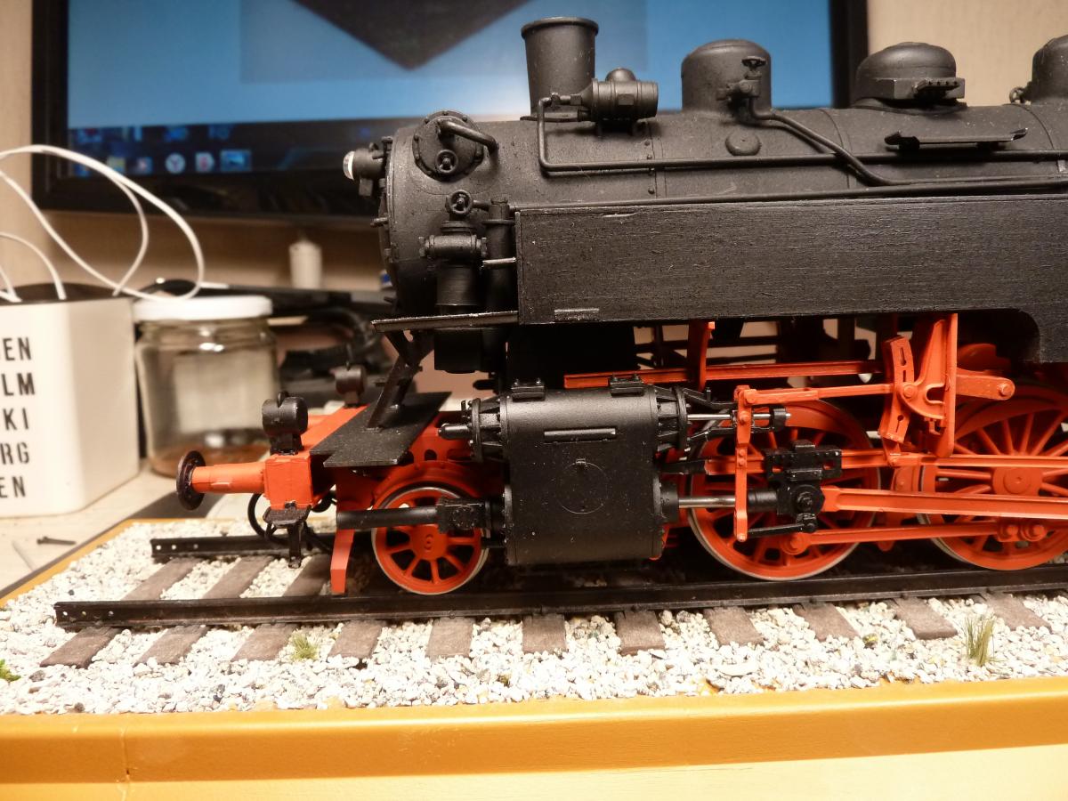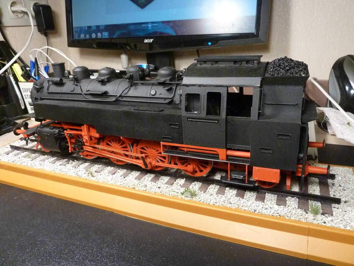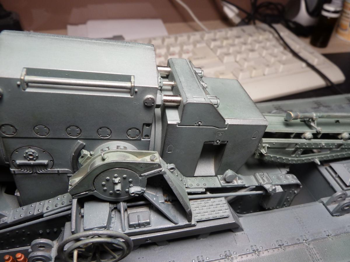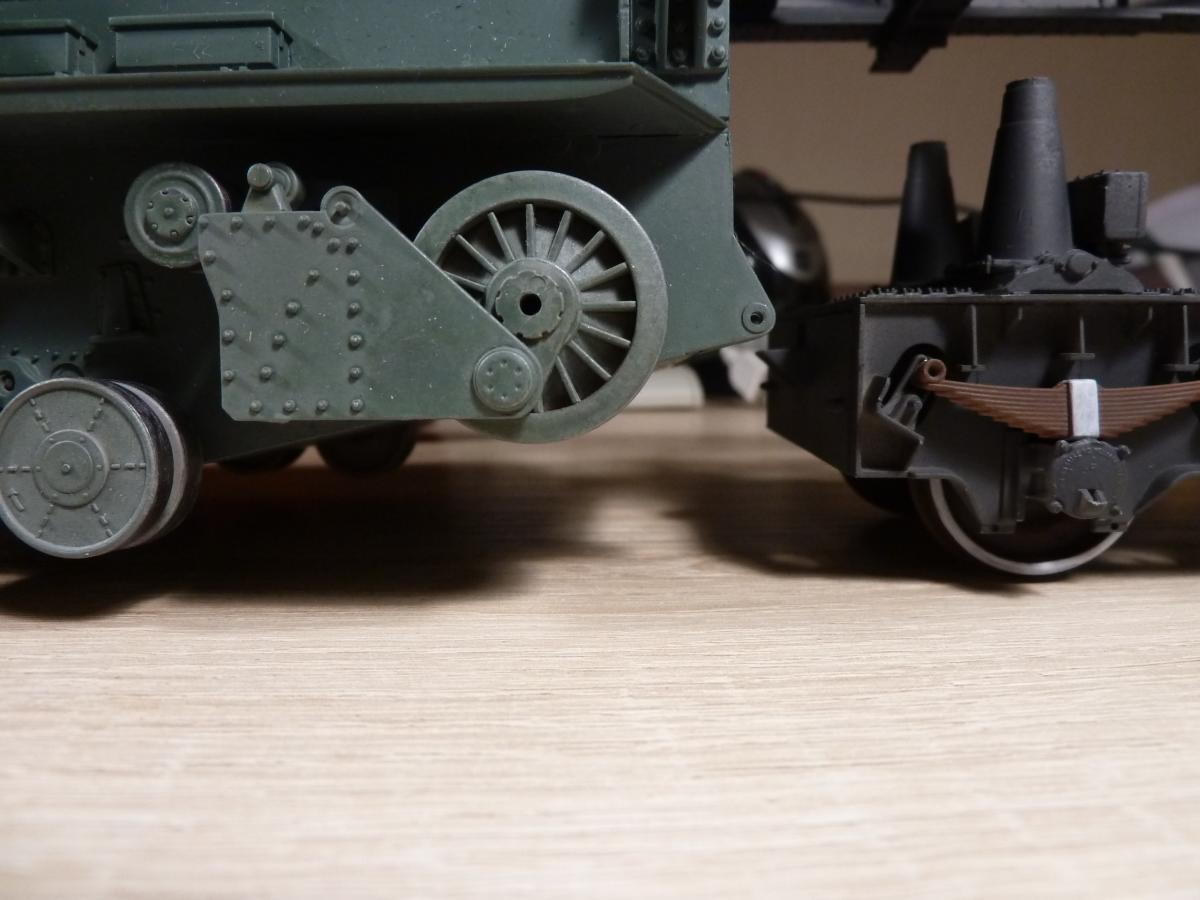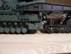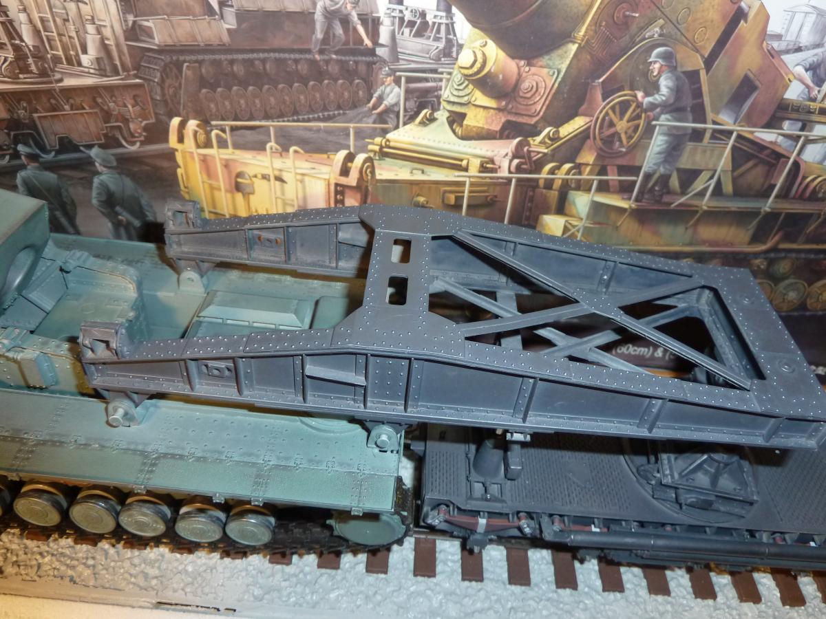 Меня тут сомнения посетили. Модель можно собрать в двух положениях. В походном ,когда её везут на ж/д платформах и когда она сама передвигается. В походном положении у неё катки поджаты, но смотрится как-то не очень (моё мнение). Ну и склеил я её, когда катки опущены,т.е. когда она двигается. И вдруг мне стукнуло в голову, а вдруг катки рельс будут касаться. Собрал на скорую руку всё на соплях, вроде нет, всё нормально.
