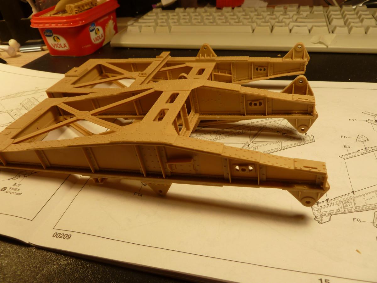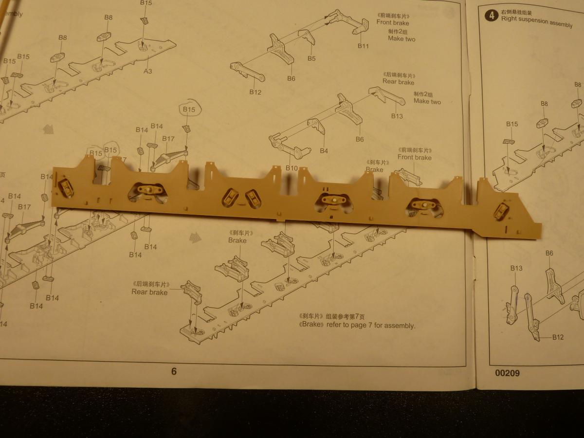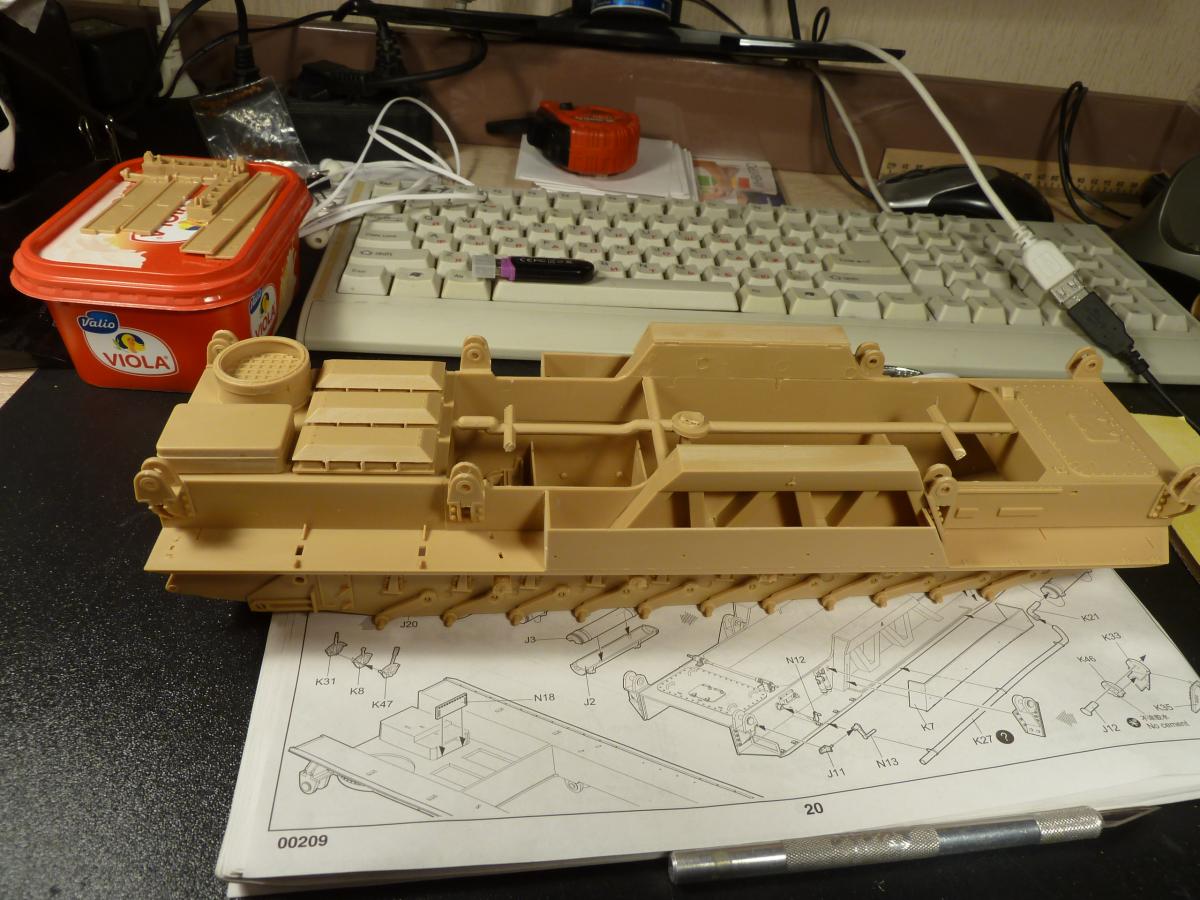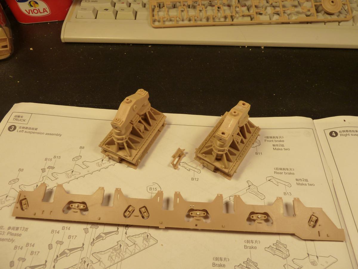 Меня тут сомнения посетили. Модель можно собрать в двух положениях. В походном ,когда её везут на ж/д платформах и когда она сама передвигается. В походном положении у неё катки поджаты, но смотрится как-то не очень (моё мнение). Ну и склеил я её, когда катки опущены,т.е. когда она двигается. И вдруг мне стукнуло в голову, а вдруг катки рельс будут касаться. Собрал на скорую руку всё на соплях, вроде нет, всё нормально.