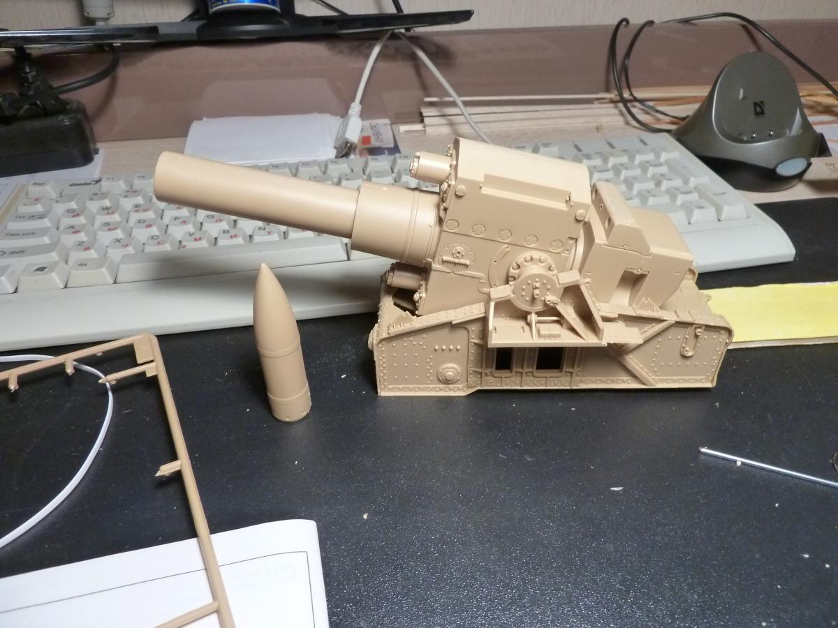В выходные решил покрасить модель. Грунтовал из балончика, очень удобно, быстро, но расход ужасный половина мимо. Красить решил аэрографом, опыта ни какого. Намучился с ним, то плюёт, то еле-еле пылит. Вообщем с горем попалам покрасил. Базовый цвет сделал из четырёх красок. Чёрный, серый, голубой и зелёный. Долго всё перемешивал, пока не понравилось. Чтобы точно цвет передать сделал восемь снимков и только один кадр получился. Покрасить получилось только мортиру, а потом что-то случилось аэрографом. Начал железнодорожные платформы собирать.