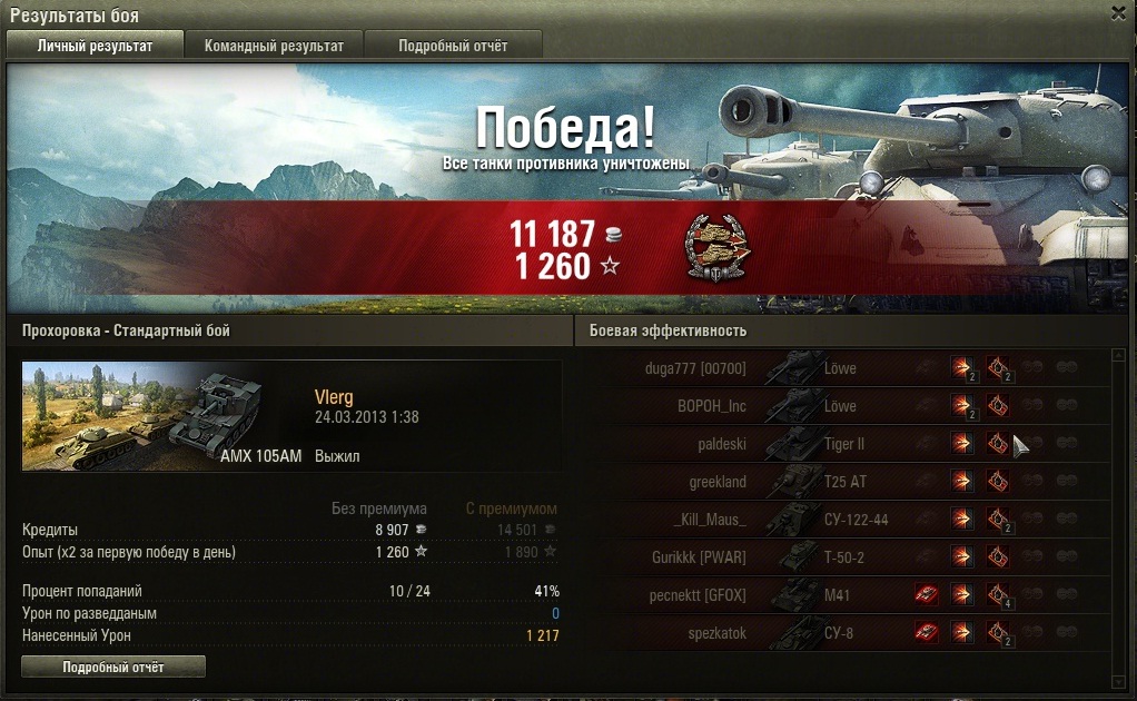 За 100 с небольшим боев немного прокачал экипаж, и играть стало веселее. Разового урона по тяжам все равно маловато, но за счет повышения точности и скорострельности по мере прокачки общий урон за бой все равно растет. Однако больше 1500 очков урона за бой и больше 700 очков опыта пока что редкость :) В целом, если приноровиться к низкой скорости полета снаряда и поставить раскачанный экипаж, то для своего уровня боев танк получится весьма влияющий на исход боя (даже сейчас, с экипажем 93%, регулярно набиваю опыта больше, чем любой другой игрок команды)