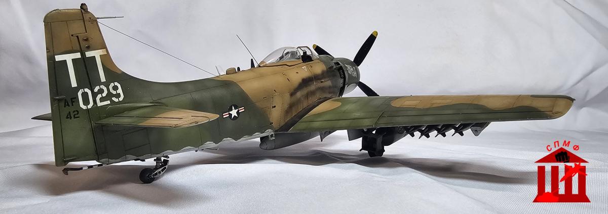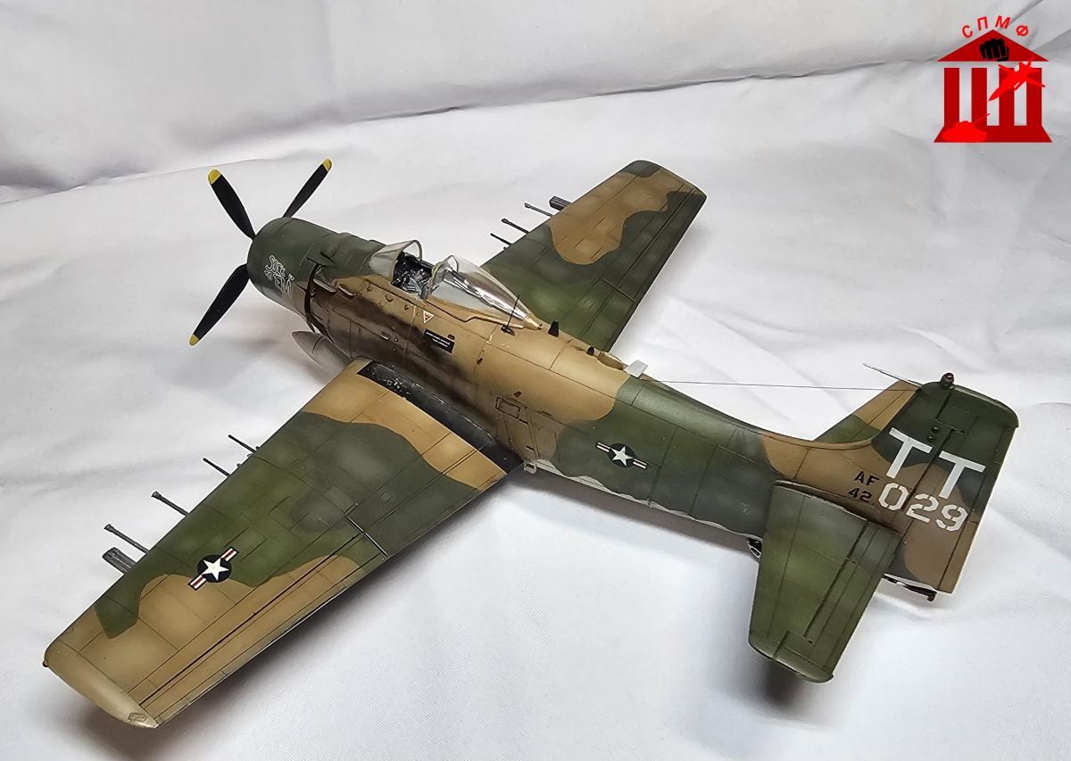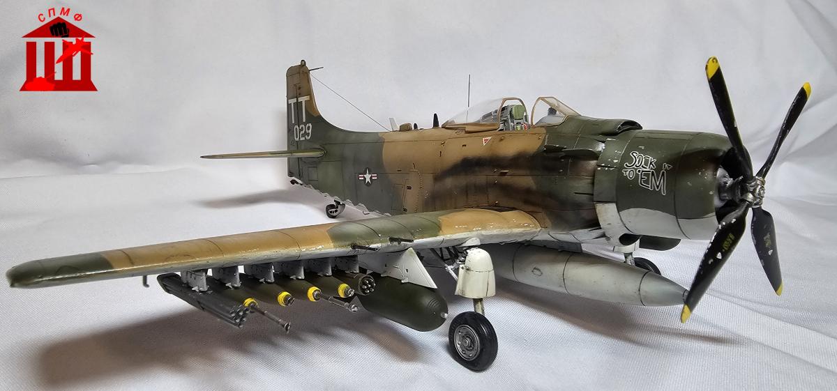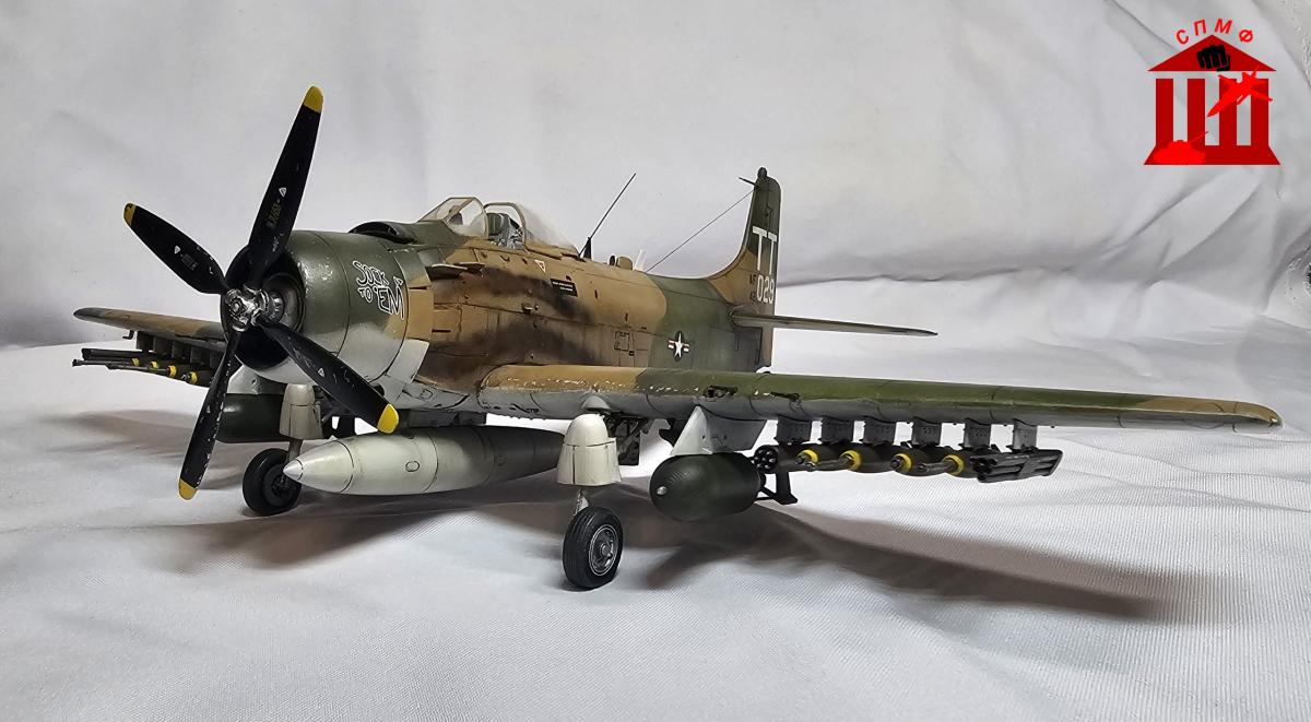 Доброго времени. Фронтовой вариант штурмовика "Skyraider". Приятный в сборке набор, из дополнений: декаль кабины от Quinta, стволы и трубка Пито от Master, а также смоляные колёса под нагрузкой. P.S. Во время работы над моделью ушёл из жизни Сюнсаку Тамия, поэтому его памяти посвящается.