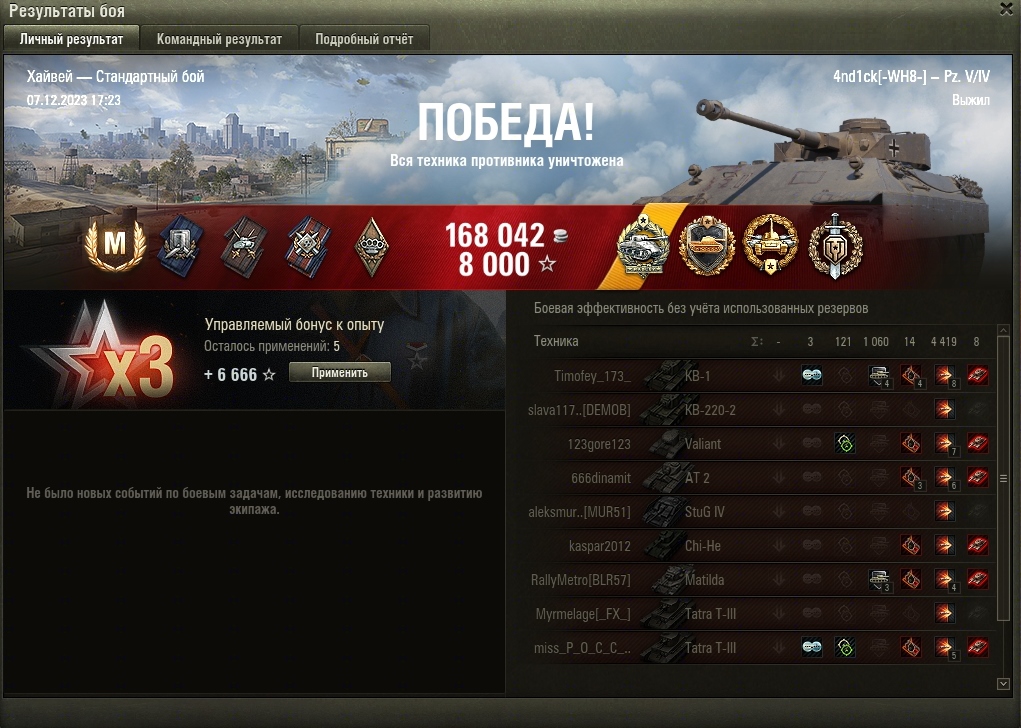 Мне в целом точности хватает вроде, а вот тот же обзор в конце боя порой может неплохо зарешать. Мне скорее скорости не хватает, вот турбину экспериментальную я бы попробовал, но жертвовать боновым вентилем тоже не особо хочется. P.S. Вроде встречались с вами несколько раз в боях, ник знакомый