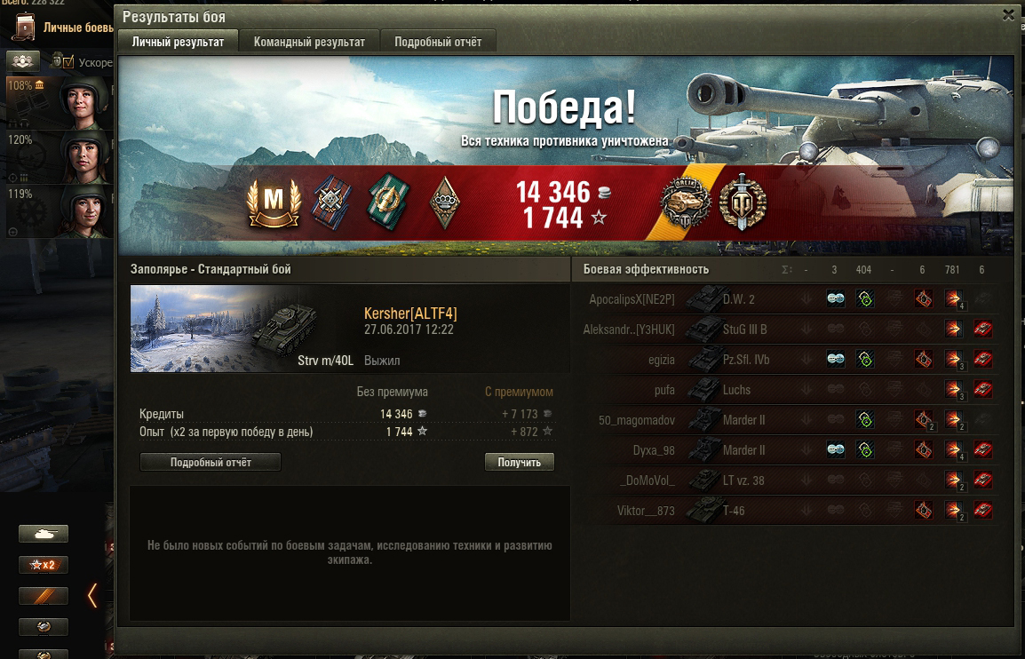 Понравился. После кв-1 было боязно уходить на него - таким он иногда кажется беспомощным, когда виден в стереотрубу обзорной пт на равнине. Но это ощущение поверхностное. За 50 проведенных боев взято 2 мастера, странно, что так низко поставлена планка. Все неплохо, напомнил мне квас, таким, какой он был когда-то до реформы, но с критованным двигателем (все таки, тихоходен, тут сказать нечего). Из недостатков конечно - слепота и высокая башня, весьма уязвимая в профиль. В каждом (!) бою почему-то выносят радиста - по видимому, вылазит из люка ротозейничать. Думаю нагрузить его голдой из расчета, чтобы хватило на ТТ-8 +еще 2 - на рикошеты и непробилы. Все таки балансит вниз его часто. Да, М-6 почему-то тоже показался трудным врагом, даже О-и не так беспокоит. Может М-6 порезвее и кд у него меньше - надо глянуть как там соотношение.