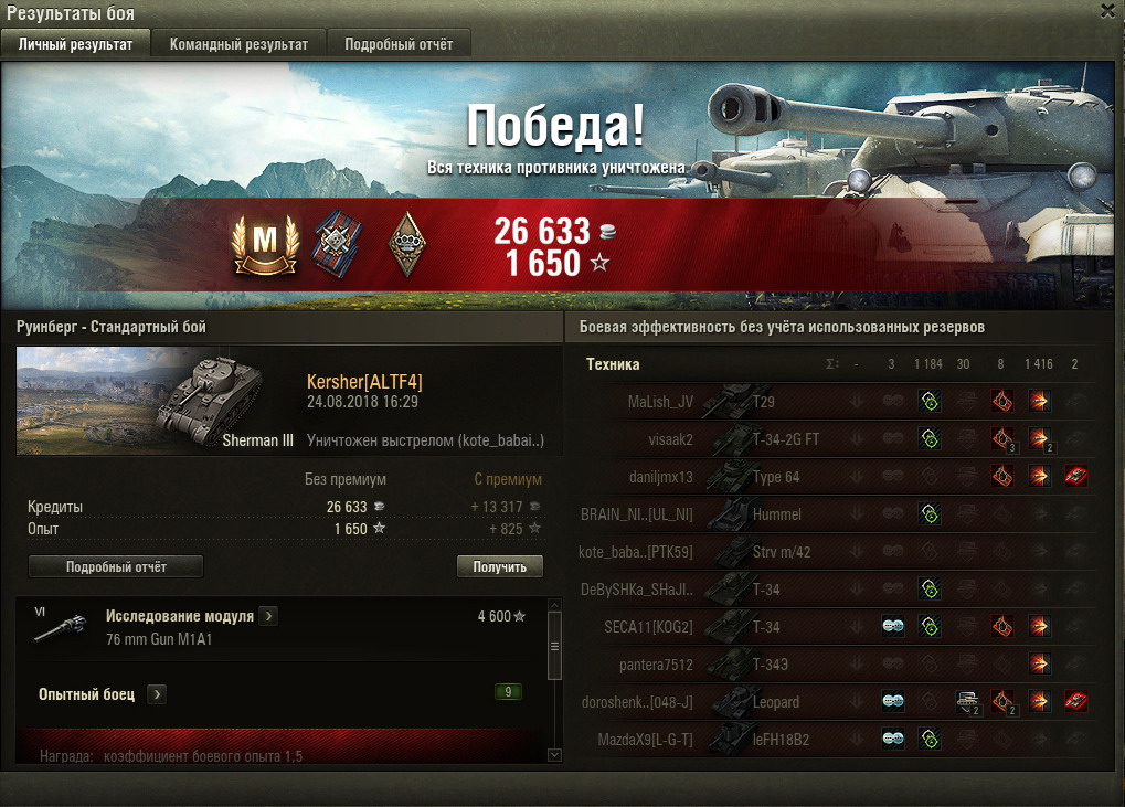 Да, клонированный образец. Пусть будет. С М4 было приятно работать и с этим тоже славно, хотя английский экипаж у меня на перк слабее американского. Вот случилось приятное http://cdn-frm-eu.wargaming.net/wot/ru/uploads/monthly_08_2018/post-6000806-0-72109000-1535447214_thumb.jpg Подчеркну, что играл в Руинберге с верхнего респа, нижний по прежнему скверный.