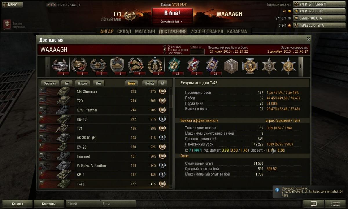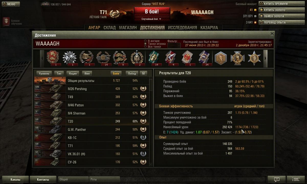 Собственно,выводы в статье сделаны правильные,особенно насчет невысокого процента побед. Взгляните,например. http://cdn-frm-eu.wargaming.net/wot/ru/uploads/monthly_06_2013/post-600634-0-19977800-1372348154_thumb.jpg http://cdn-frm-eu.wargaming.net/wot/ru/uploads/monthly_06_2013/post-600634-0-56976000-1372348168_thumb.jpg На скринах-моя стата на т-43 и т20. И там,и там средний урон за бой выше среднесерверного. На т20 он незначительно больше,однако рейтинг эффективности на нем несколько меньше. Но,как видно,при практически равных показателях процент побед на т20 значительно выше,на целых 13%. То ли мне крайне дико не везет на т-43,то ли квг не хочет,чтобы я на нем побеждал,не знаю уже что и думать.