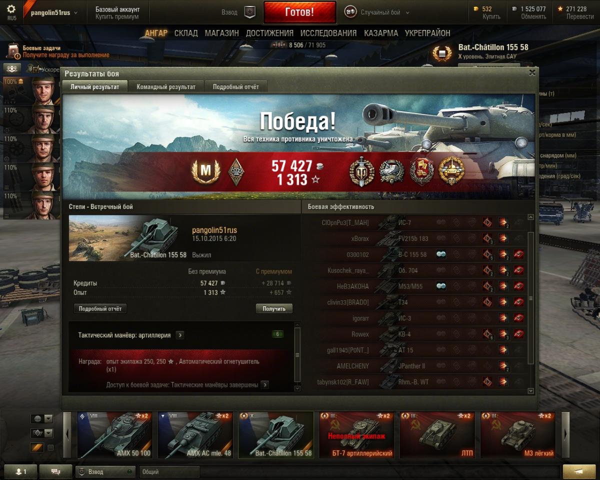Победа! Бой: Жемчужная река 12.01.2014 6:56:49 Танк: Матильда IV Получено опыта: 2 154 (x2 за первую победу в день) Получено кредитов: 30 759 Достижения в бою: «Воин», Медаль Рэдли-Уолтерса
