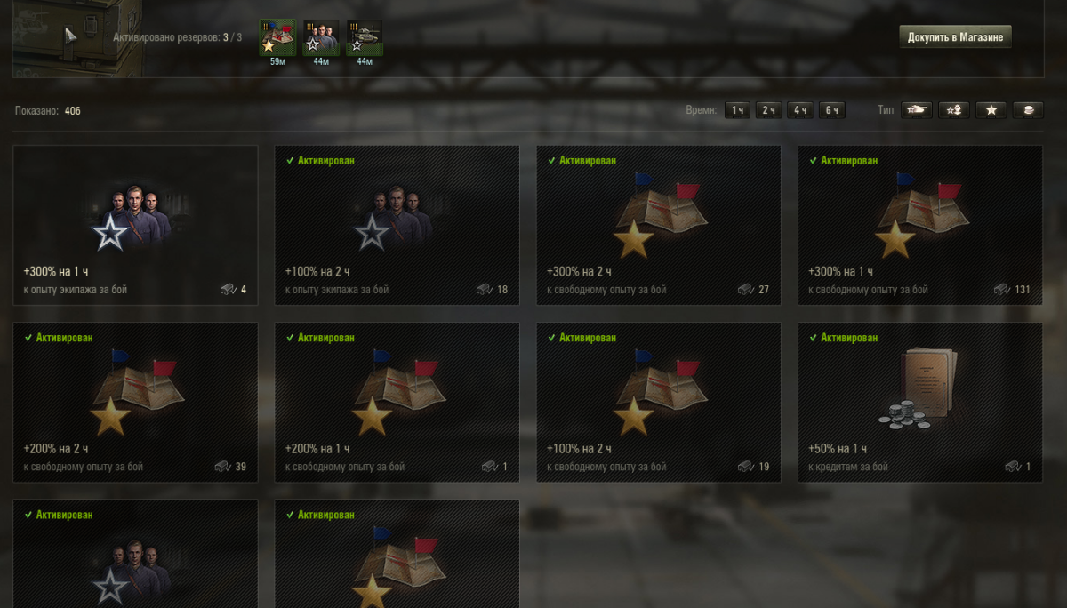 Решил поиграть в Лф, включил игру в безопасном режиме, активировал личные резервы на два часа (к свободному опыту опыту экипажа и серебро) и поехал в бой потом смотрю результаты за бой ... а я в минусе http://cdn-frm-eu.wargaming.net/wot/ru/uploads/monthly_02_2019/post-6109463-0-89246700-1550004711_thumb.pnghttp://cdn-frm-eu.wargaming.net/wot/ru/uploads/monthly_02_2019/post-6109463-0-59215900-1550004729_thumb.png ну думаю сам *** (может как ошибся и не активировал на серебро смотрю в верхнем левом углу и вправду активный резерв вместо серебра +к опыту за бой , захожу в резервы а там вижу что все 4 резерва активированы http://cdn-frm-eu.wargaming.net/wot/ru/uploads/monthly_02_2019/post-6109463-0-70251900-1550004838_thumb.png пробовал перезапустить резервы и сейчас имею вот такой вариант http://cdn-frm-eu.wargaming.net/wot/ru/uploads/monthly_02_2019/post-6109463-0-76245000-1550005058_thumb.pnghttp://cdn-frm-eu.wargaming.net/wot/ru/uploads/monthly_02_2019/post-6109463-0-49602200-1550005072_thumb.png как так получается что я не правильно делаю?? да и доходность просто супер))
