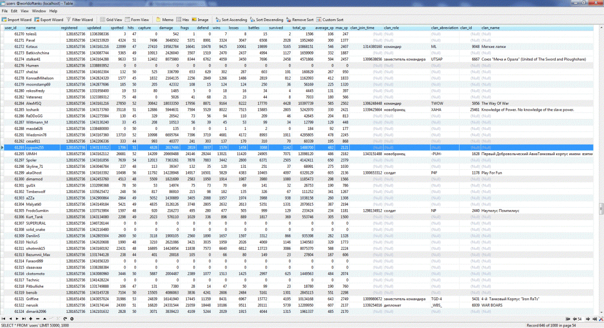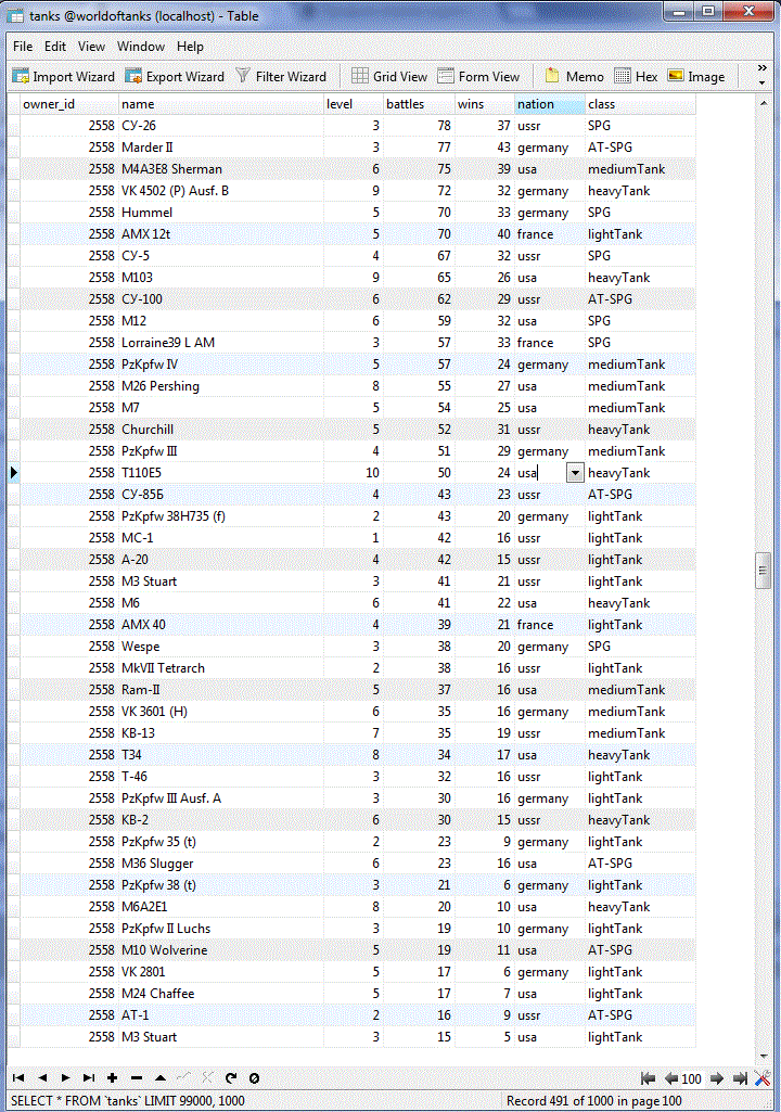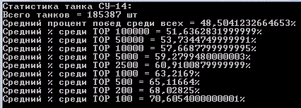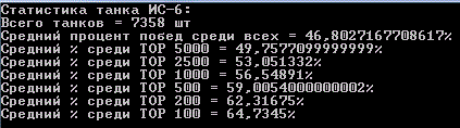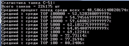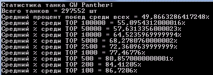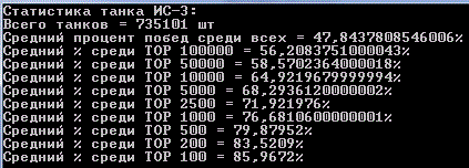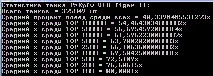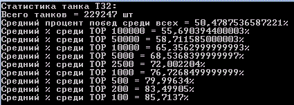 Наконец я закончил сбор статистики всех игроков и их танков! Статистика по игрокам подробная, по танкам только количества побед и боёв. На сбор данных ушло порядка 4 дней и 40гб дискового пространства. А вот как это всё выглядит: http://cdn-frm-eu.wargaming.net/wot/ru/uploads/monthly_07_2012/post-64595-0-32605700-1343546133_thumb.gif http://cdn-frm-eu.wargaming.net/wot/ru/uploads/monthly_07_2012/post-64595-0-67490000-1343546124_thumb.gif Начну с того, что оглашу некоторую техническую информацию: Количество аккаунтов: http://cdn-frm-eu.wargaming.net/wot/ru/uploads/monthly_07_2012/post-64595-0-24844200-1343546125_thumb.gif Суммарное(исследованное + как минимум 1 бой) количество танков в ангаре у игроков: http://cdn-frm-eu.wargaming.net/wot/ru/uploads/monthly_07_2012/post-64595-0-33414200-1343546629_thumb.gif Т.к времени на каждую выборку из базы данных уходит не мало(~40мин), я обработал, на данный момент, только два танка E-100 и T110E5 UPD: после нескольких часов индексации удалось снизить время до 10мин на танк. Внимание! В статистику попадали игроки, которые наездили на танке более 100 50 боёв. (за исключением общего % по танку) Статистика по всем танкам в удобной таблице. Сортировка по уровню. (много картинок) Exel-таблица: http://cdn-frm-eu.wargaming.net/wot/ru/4.1/style_extra/mime_types/zip.gif wot.rar 17,56К wot.rar