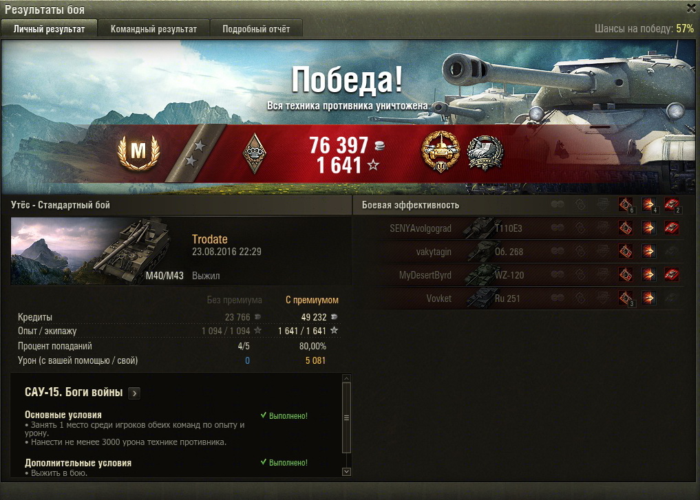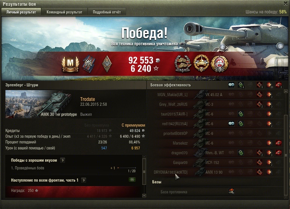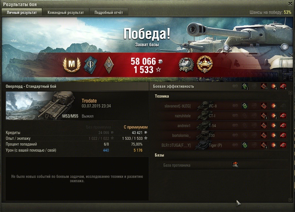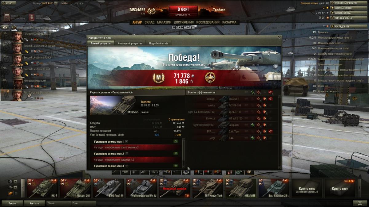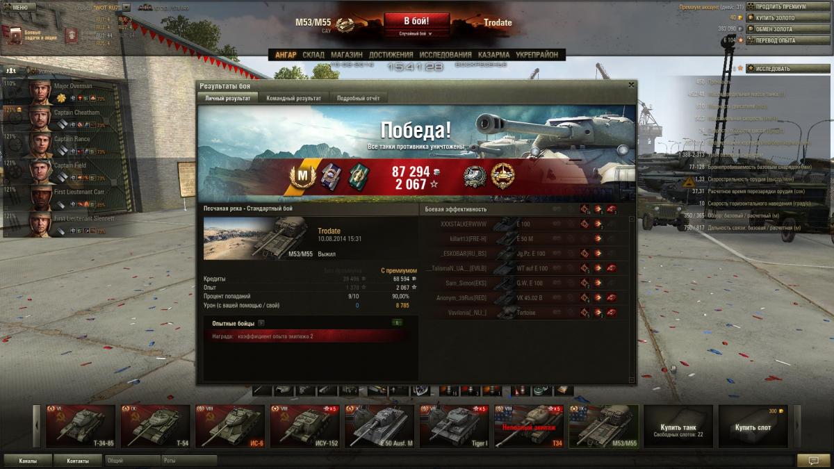 На 5355 сделал бомбардира, карта "песчанная река"е100 и маус по центальному рву пошли на прорыв, главное терпение жди когда будут шотными. На сау15 застрял, по урону сколько угодно первый по опыту-беда((((