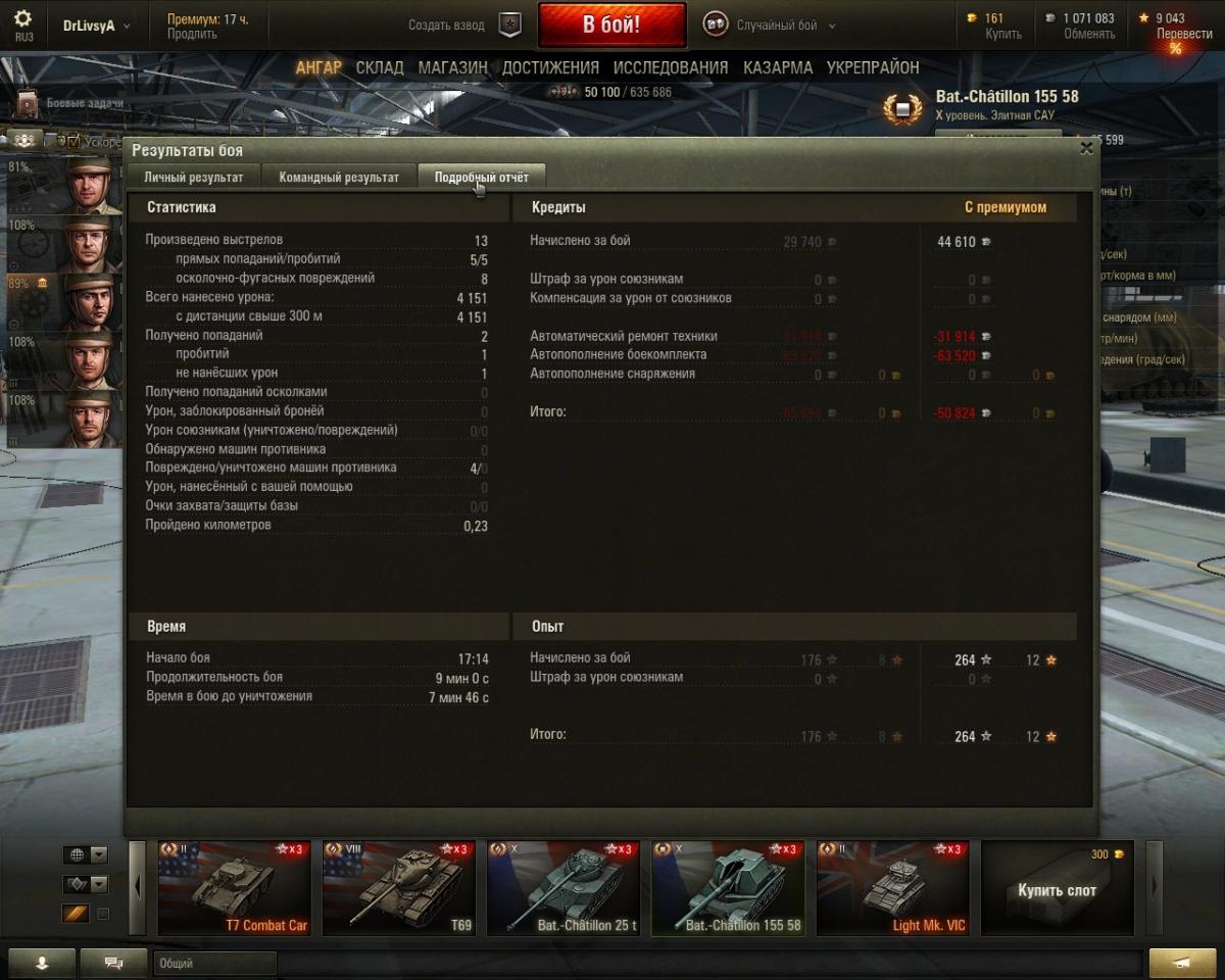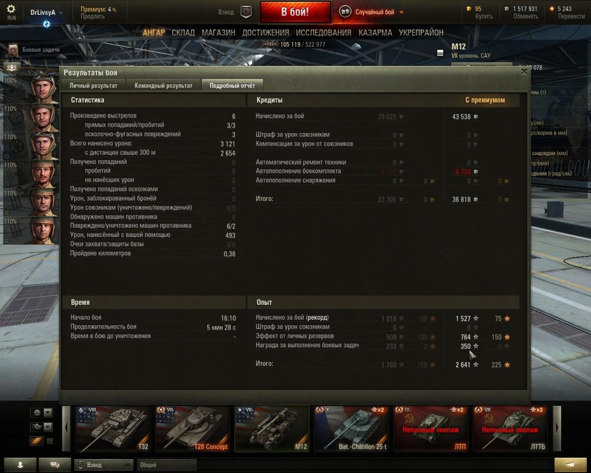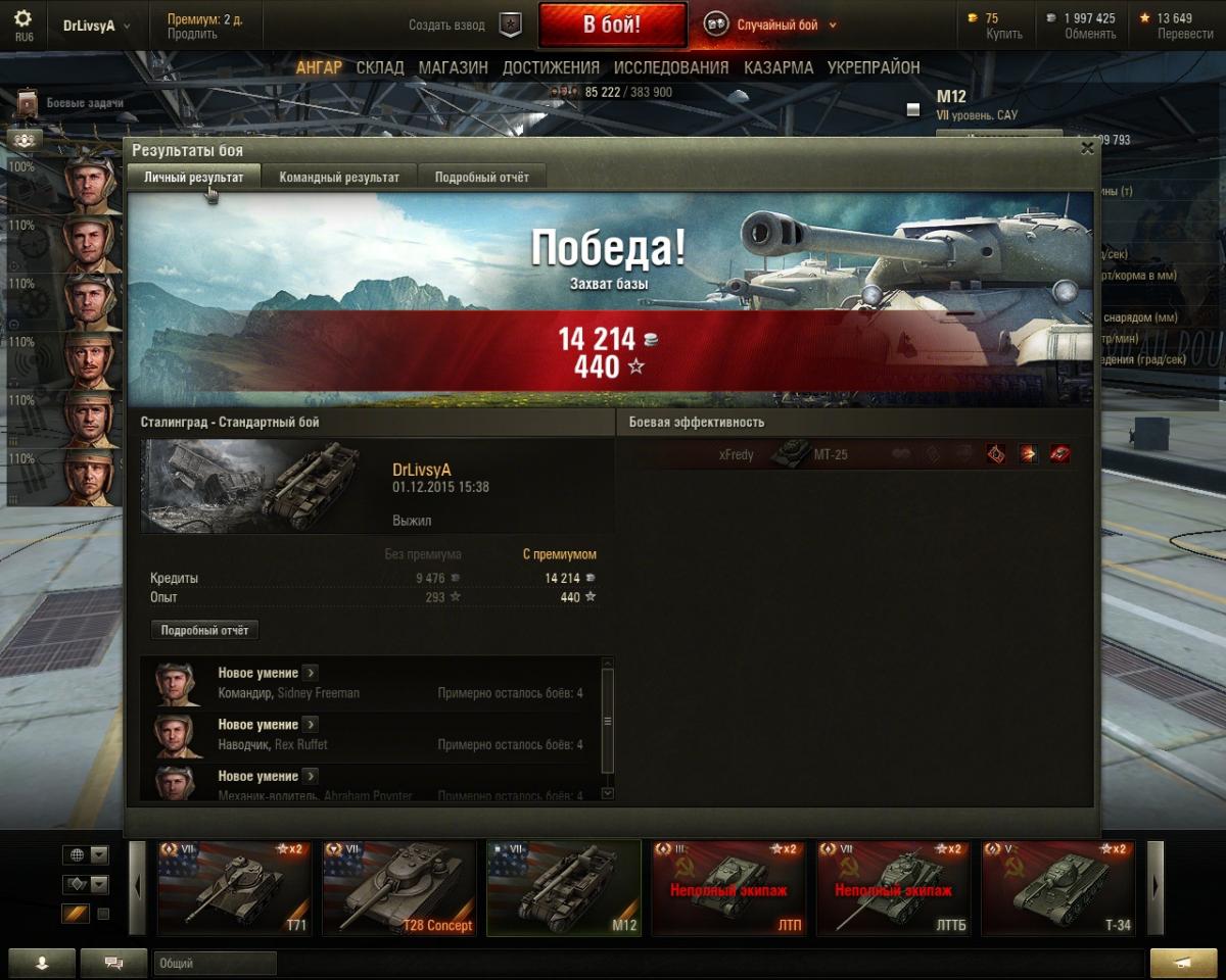 Прошел Бишопа, прикольный танчик, ему бы экипаж... Но, имея желание поскорее и подешевле прокачать Фунтика, открыл за накопившийся/наЛБЗшенный свободный опыт Бишопа, за серебро со скидкой обучил экипаж и вперед. Очень интересный танчик, если бы экипаж был 100% и хотя бы пару перков - просто рвал бы на части! Даже Мастера на нем не взял. Ничего, 1 класс при 67% побед тоже хорошо)