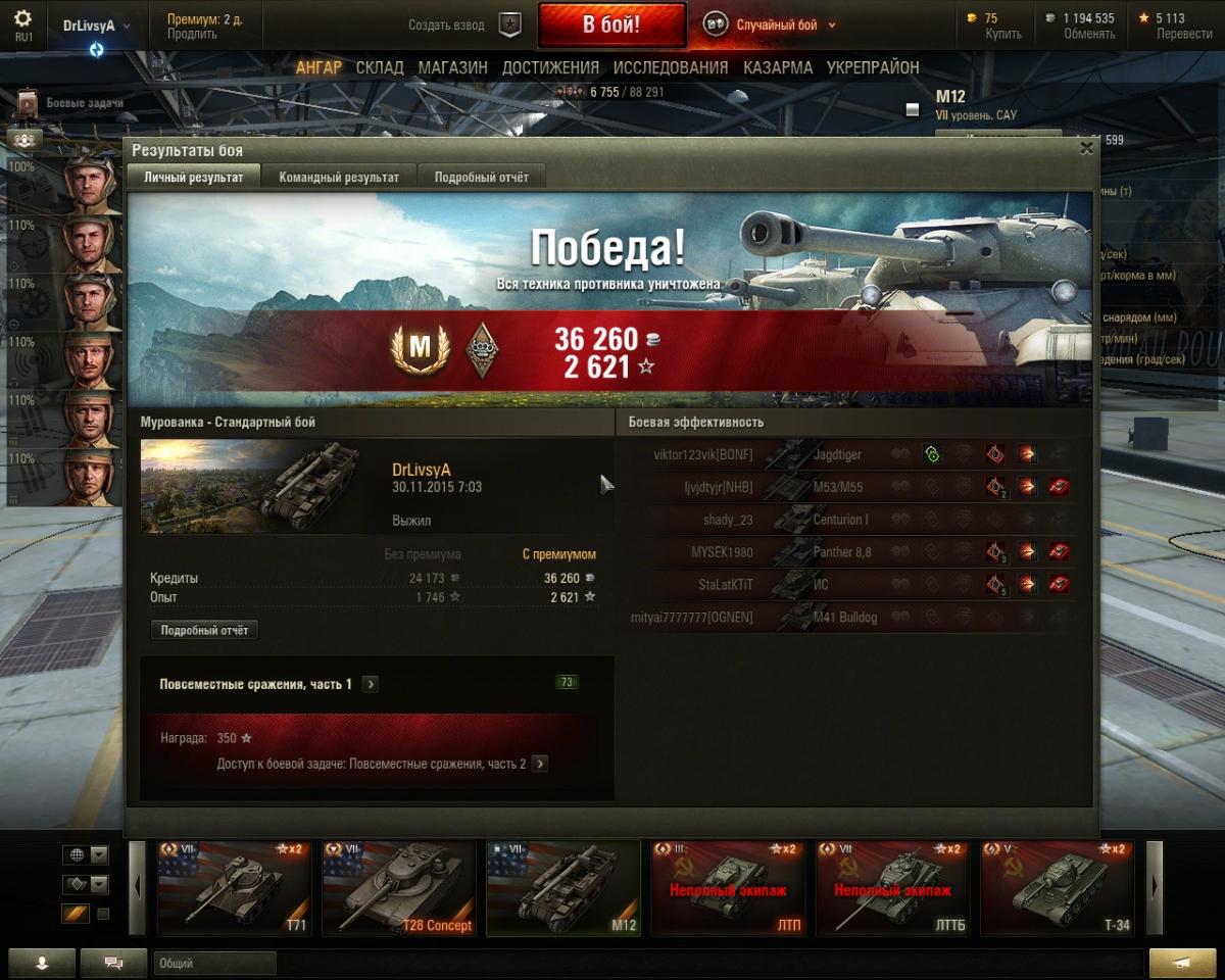Взял Мастера. ББ на Тундре это что-то!))) http://cdn-frm-eu.wargaming.net/wot/ru/uploads/monthly_11_2015/post-6180828-0-30731500-1447595399_thumb.jpghttp://cdn-frm-eu.wargaming.net/wot/ru/uploads/monthly_11_2015/post-6180828-0-39349800-1447595409_thumb.jpg ЗЫ. Разрабы обещают пофиксить старый глюк с невозможностью выйти из взвода? А то он нет-нет да вылазит... http://cdn-frm-eu.wargaming.net/wot/ru/uploads/monthly_11_2015/post-6180828-0-26836700-1447595703_thumb.jpg Видели серый крестик - он не нажимается...
