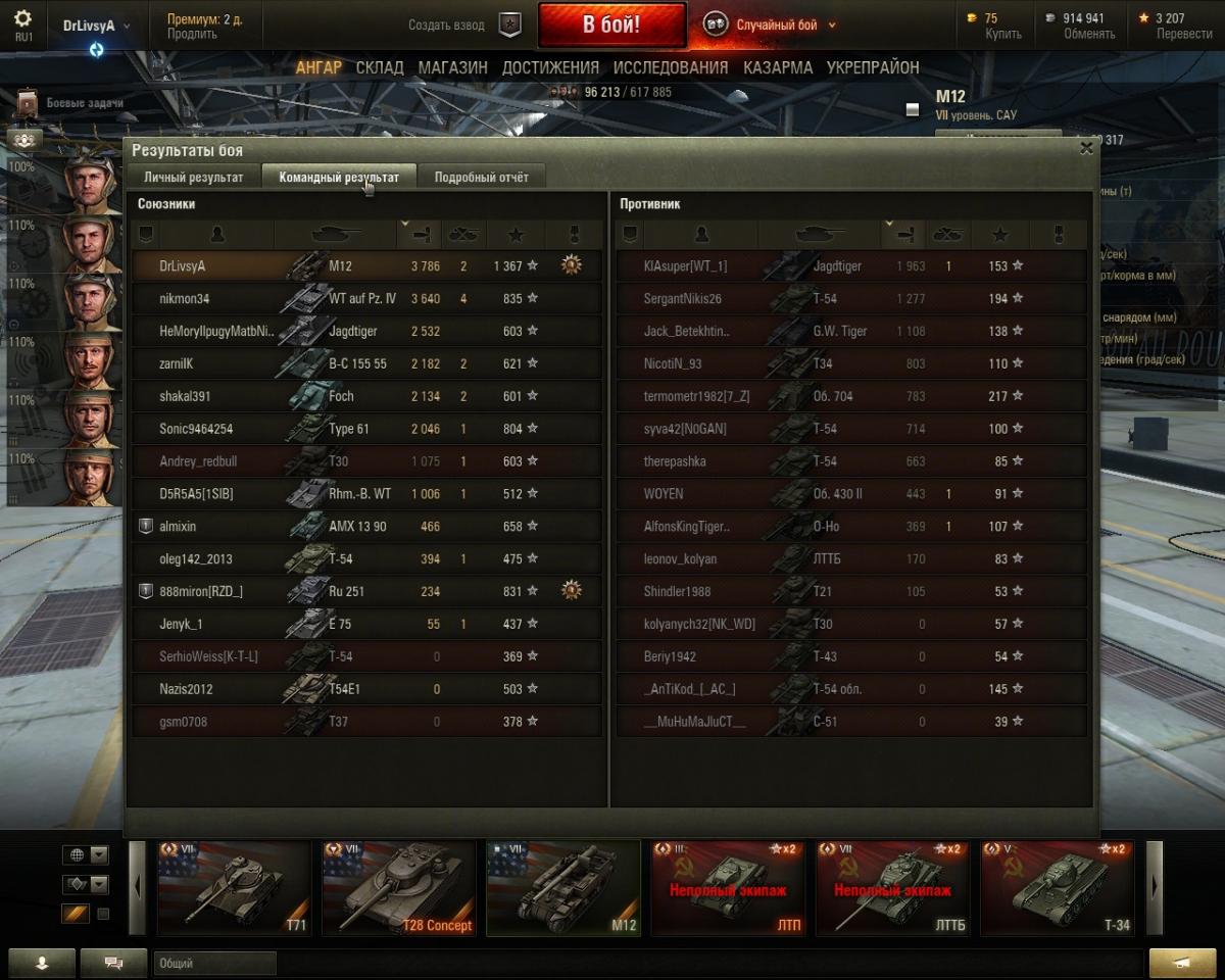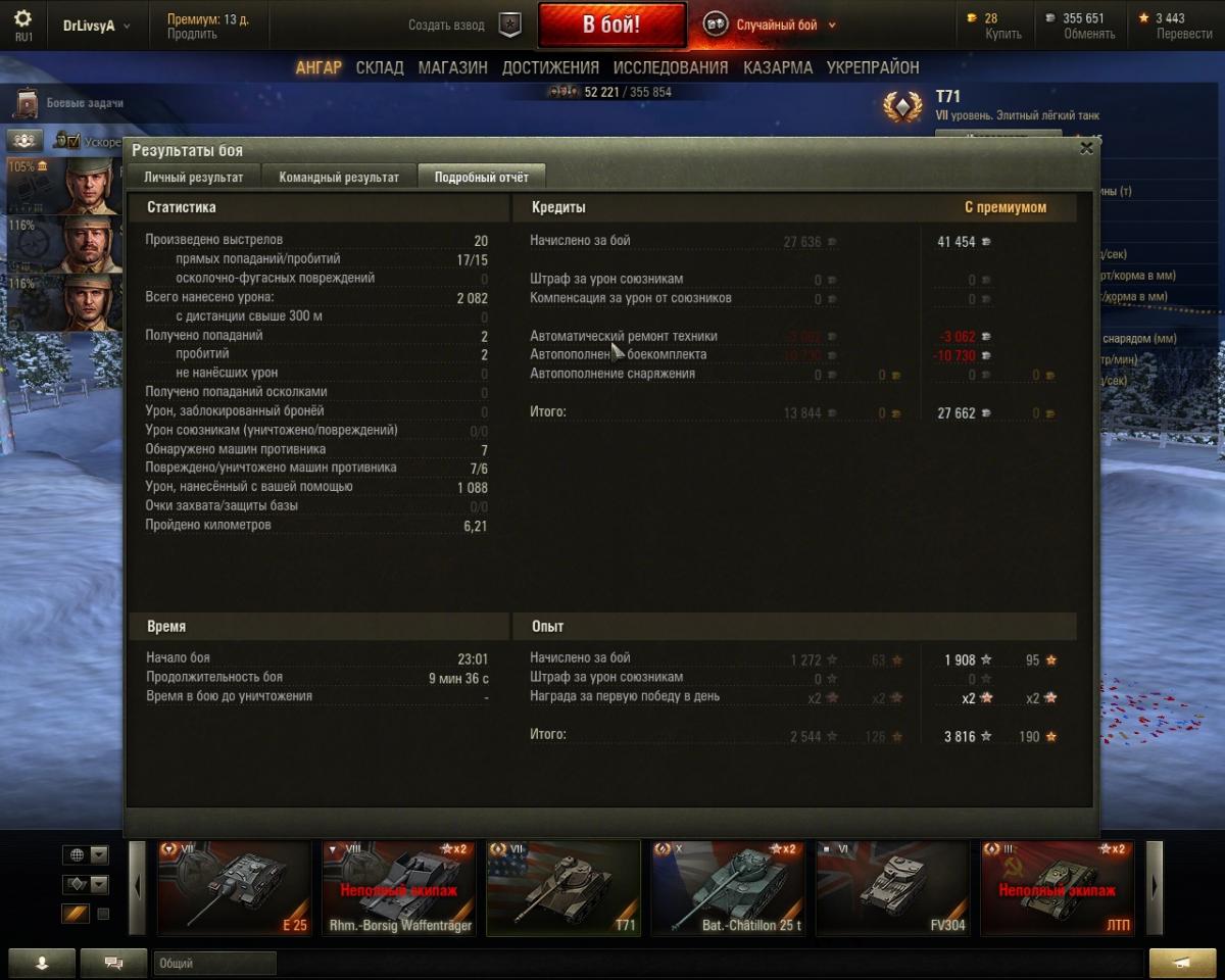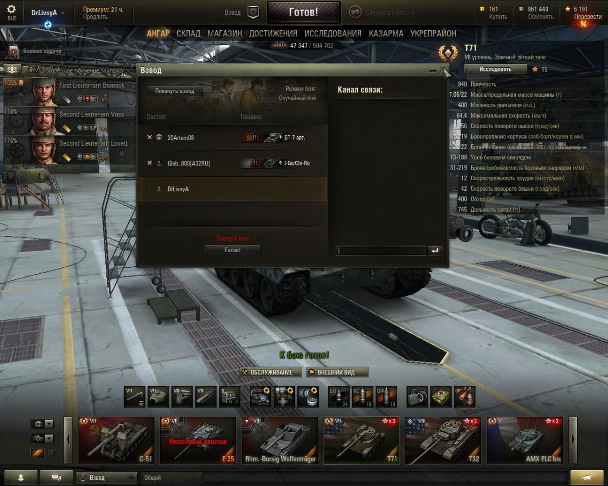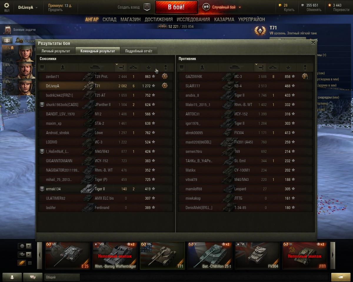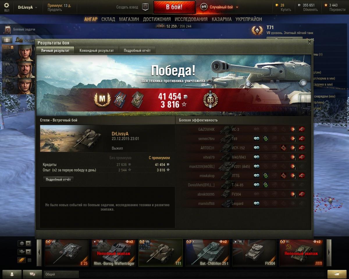 Вчера снял звезду со своего Т71го. Есть одно наблюдение: В начале боя все светляки собрались в одном месте, видимо, рассчитывая на групповой прорыв в тыл противника. А на другом фланге и в центре карты ПТ противника спокойно дамажили наших союзников, потому как они их тупо Не видели. Есть предложение: в начале и середине боя обеспечьте союзников светом, пусть они зарабатывают себе дамаг, а вам засвет, а в конце уже можно врываться. И перестаньте хвастаться своим дамагом, потому что заработок светляка - засвет. А если светляк дамажит, то его союзники Не дамажат, а в это время противник дамажит их, что ведет команду к поражению. Подумайте, много ли ТТ и СТ снимают досылатель и ставят просветленку? Их очень мало, и это те, кто пытается повысить автономность своего танчика. Потому как без обзора они - просто куски железа на разборке у противника. Простой пример, ИС-3: Обзор 350м в топе, в стоке всего 330. Его шансы выжить при встрече с Борщиком, у которого обзор 360м, а маскировка около 20% очень малы. (Это значит, что он обнаружит ИС3 на дистанции около 300-330м (без стереотрубы), а ИС-3 обнаружит Борща токо на примерно 250м) Борщ его тупо расстреляет из инвиза, а сам даже во время выстрела не засветится. На мой Т71 установлена Просветленка, Стереотруба, а у экипажа прокачан перк Боевое Братство. Хочу еще перков на обзор, но на трех членах экипажа это затягивается на долго. А снимать стаб в пользу вентиляции нерационально, овчинка выделки не стоит. Итого: обзор в движении - 400+40+10=450м обзор в покое со Стереотрубой - 400+100+10=510м. Можно спокойно обнаруживать Борща на всех дистанциях его обзора (с его стереотрубой) во время его выстрела. В покое под сеткой его очень трудно даже на открытой местности обнаружить... На всякий случай, пока акция, можно за полцены прикупить сотню-другую "ящиков с колой", Обзор увеличится еще на 20м. Конечно, при наличии одного-двух миллионов серебра.