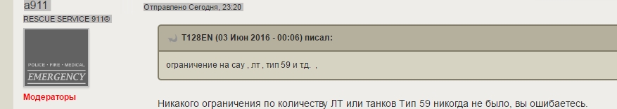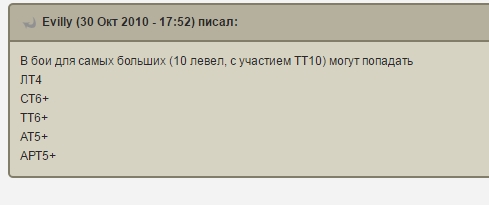 Не вам судить о моих познаниях в игре . Дайте ссылку или скрин на ответ компетентного разработчика ! , а не модератора , который опровергает это ну можно ещё скрин с 10 лт в бою с 10 уровнями в рандоме Вот что мне сказали вы же уважаемый а911 в другой теме