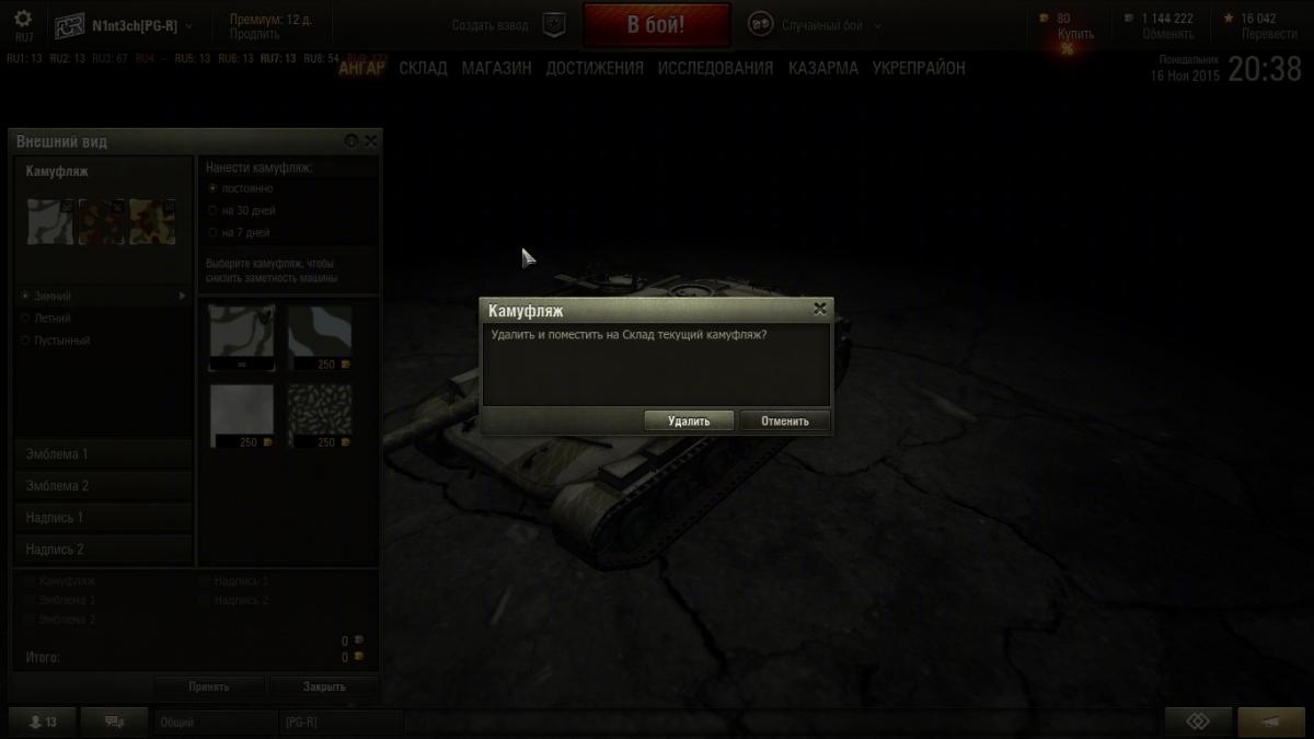 Можно ли убрать постоянный камуфляж (за голд) на склад,и потом поставить на другой танк.Вот скрин,на нем написано что с танка можно удалить камуфляж,и убрать его на склад.