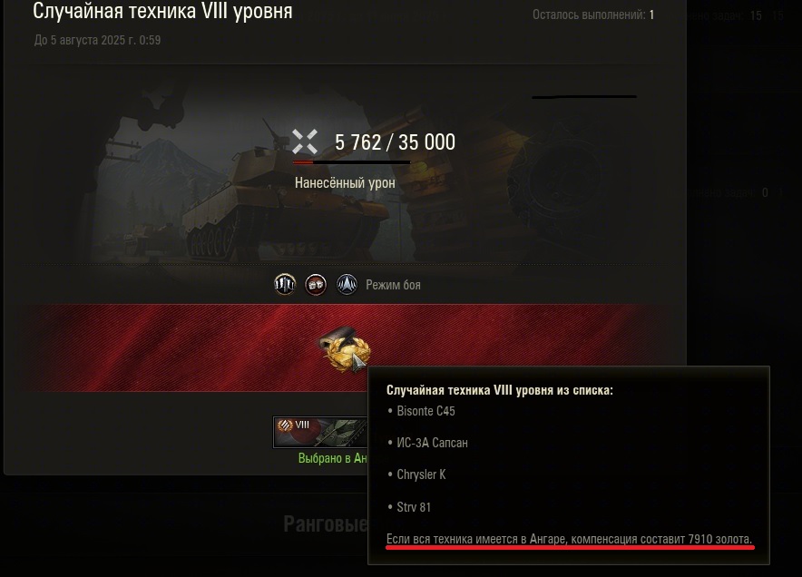 Нашел ответ на вопрос - "Какая компенсация будет за боевую задачу на случайный танк, если все они имеются в ангаре?"! (уточнение: актуально для задачи на 8 лвл). Ответ: Если вся техника имеется в ангаре, компенсация составит 7910 золота. Итог: задача на 8лвл стоит 7700 зол. Таким образом те, у кого вся эта техника есть, потенциально могут нафармить на этих задачах 210 золота... P.S. Сама задача заключается в нанесении 35к дамагия. https://forum-mt-prod.lesta.ru/monthly_06_2025/post-6322-0-48209200-1749059469_thumb.jpg