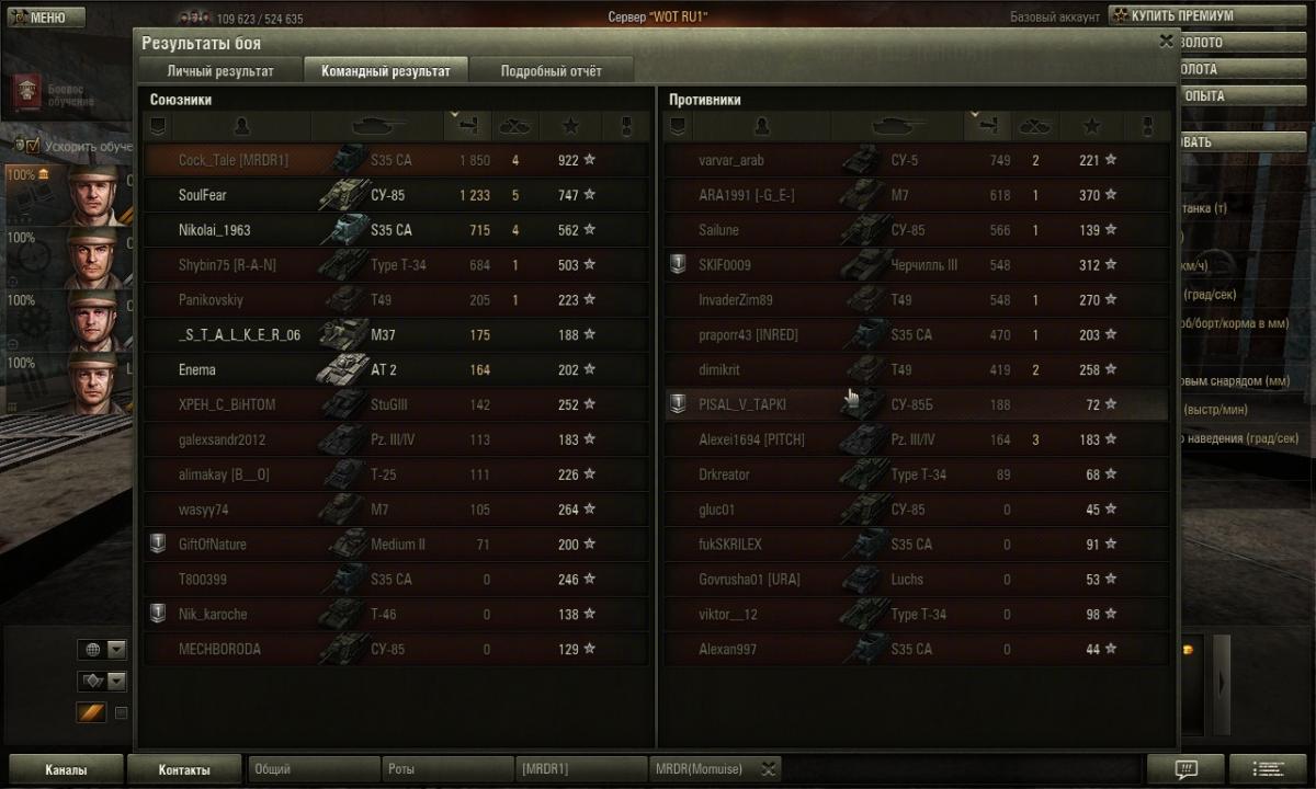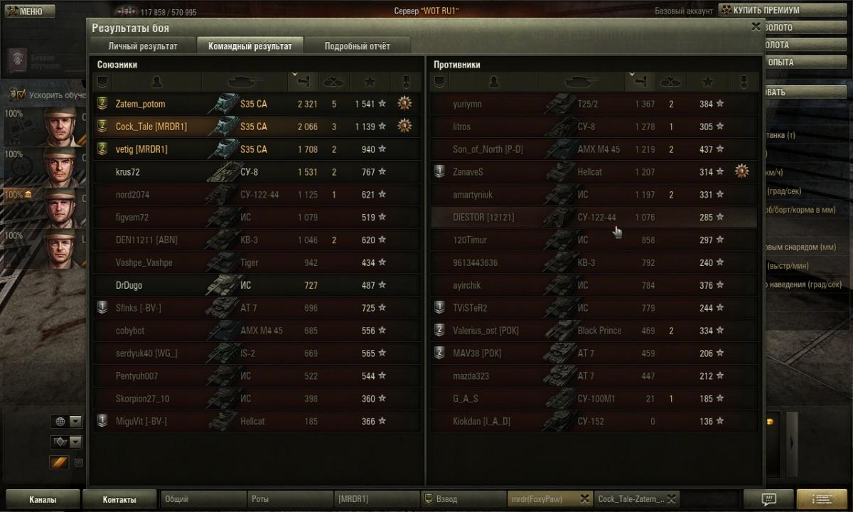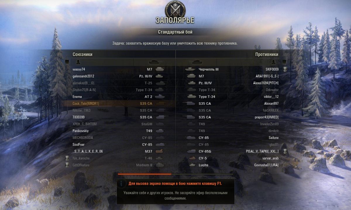 gbr337, бред. Т-49 с самого начала грамотно занял позицию, давая свет на всю гору и город. По этому свету регульнарно отрабатывали совзводники. На А0 был только один игрок на СТ, который в последстви по крабски слился. Оголился полностью фланг. Тяжи и СТ вместо того, чтобы своевременно сконцентрироваться на А0, предпочли *** на горе. Произошел успешный вражеский прорыв на А0. Тусоваться на горе после такого прорыва - верх нубства. Надо либо спускаться по склону назад, либо сваливать к домикам на H7 для дефа и поддержки оставшихся направлений. Совзводники своевременно отступили с проигранной позиции на H7. Оставшееся на горе рачье было закономерно безболезненно уничтожено противником. После прорыва А0, очевидно наступление врага по холму и городу. Т-49 своевременно не оступил и был слит, но благодаря его свету уничтожено несколько вражеских топов. К линия оголена, Центр и Право слиты. Какая атака? Нужен деф. Отдефились, в итоге ничья. В сокомандниках у взвода были одни раки, АРЛ на ПТ только адекватен. Никаких толковых атак и достойных выдвижений, которые стоило бы поддержать взводу, не было. Почти все было грамотно отыграно, потому и такой высокий рез-т на общем фоне. Маленько не хватило для победы. Буквально присутствия капельки мозга в голове у ИСовода.