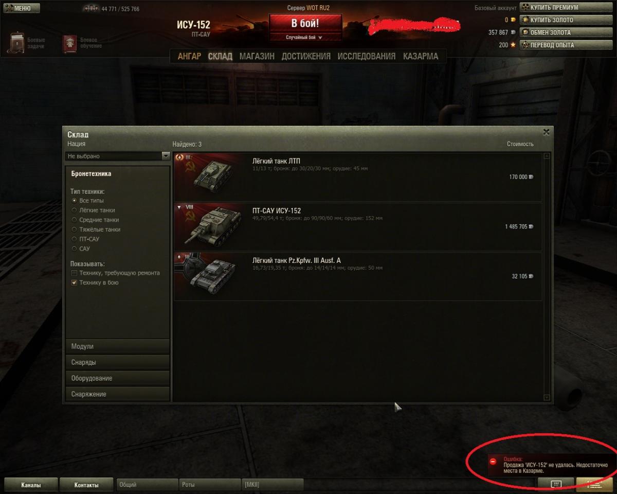 Хочу продать ИСУ-152,Захожу в склад ввожу сумму для продажи (пароль какойто!) танка и тут....Недостаточно места в казарме! Хотя свободно 9 коек из 16...! Помогите пожалуйста http://cdn-frm-eu.wargaming.net/wot/ru/uploads/monthly_09_2013/post-6377064-0-99364800-1379013265_thumb.jpg http://cdn-frm-eu.wargaming.net/wot/ru/uploads/monthly_09_2013/post-6377064-0-21431200-1379013245_thumb.jpg