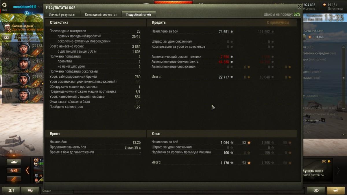 http://cdn-frm-eu.wargaming.net/4.5/style_images/wg/snapback.pngDevastator_1975 (05 Окт 2018 - 12:49) писал: Восстановил Т34 с помощью ЦПП. Кстати, кто сможет внятно объяснить - акционные танки они обязаны восстанавливать бессрочно и без очереди типа один раз в тысячелетие? А то как о стенку горохом - долдонят одно и тоже. Сделайте восстановление одного према раз в месяц и дело в шляпе. Так вот, Т34 совершенно другой по стилю танк. Даже с 70% экипажем (не ржать только)) прекрасно кустодрочит и приносит какой-никакой профит. А вот как применять Типа 59 в нынешних реалиях, я не знаю. Занять ключевую точку - мимо. Активный подсос из-за спины тяжей - натолкают по самое небалуйся. Снайперить - очень слабые снаряды, точность еще как-то где-то. Светить - нас легко пересвечивают светляки 6-7 уровней. В итоге мы имеем довольно посредственную боевую единицу, которая мало что может против одноклассников. Да что одноклассников, лобовая броня шьется танками 7 уровня с пробитием 165-170 8 из 10. Скорость перезарядки заставляет ерзать на стуле, потому что тяжелый танк имеет практически такую же с пробитием более 220 мм. А у нас с прокачанным экипажем около 8 секунд, альфа 250 и дохлый движок. И мое стойкое мнение - нужно апать скорость перезарядки до 6 секунд. Бронепробитие оставьте какое есть, апните скорость, проходимость, скорость перезарядки и уменьшите размеры до Т-54. 450 с просветленкой вам мало?