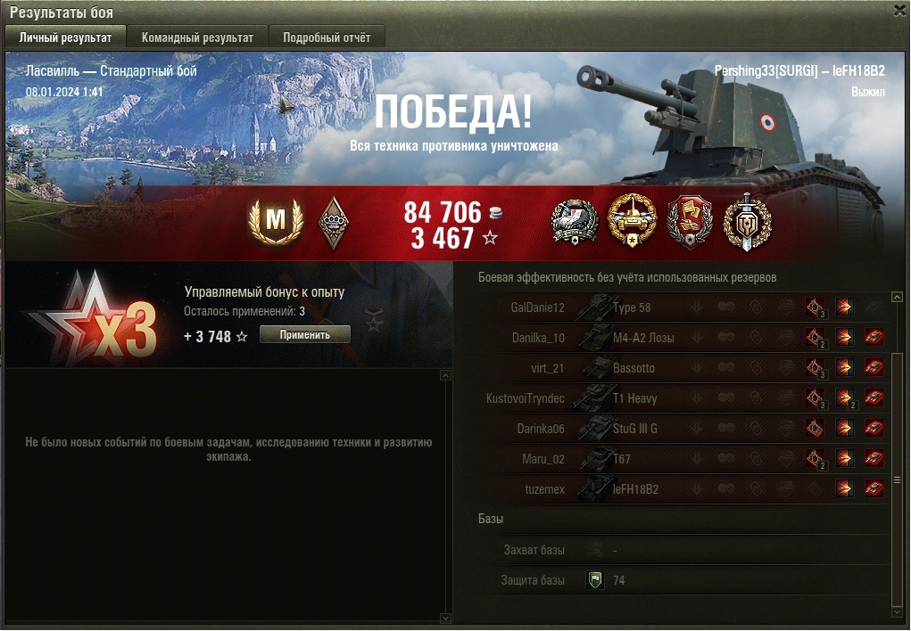 Да как-то я изначально играю максимально на победу и команду) Исключения - это только когда совзводные просят помочь с какими сложными ЛБЗ. Не дотянул 146 копеек...))) ЗЫ: осталось всего миллиончик опыта набрать, чтоб с 98,53% седьмой перк докачать...)))