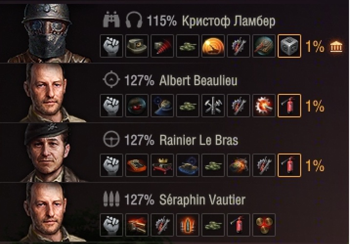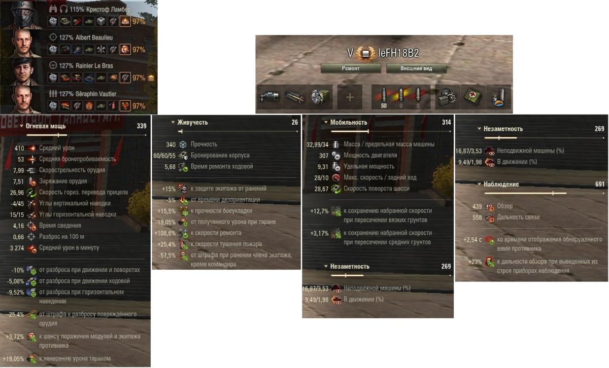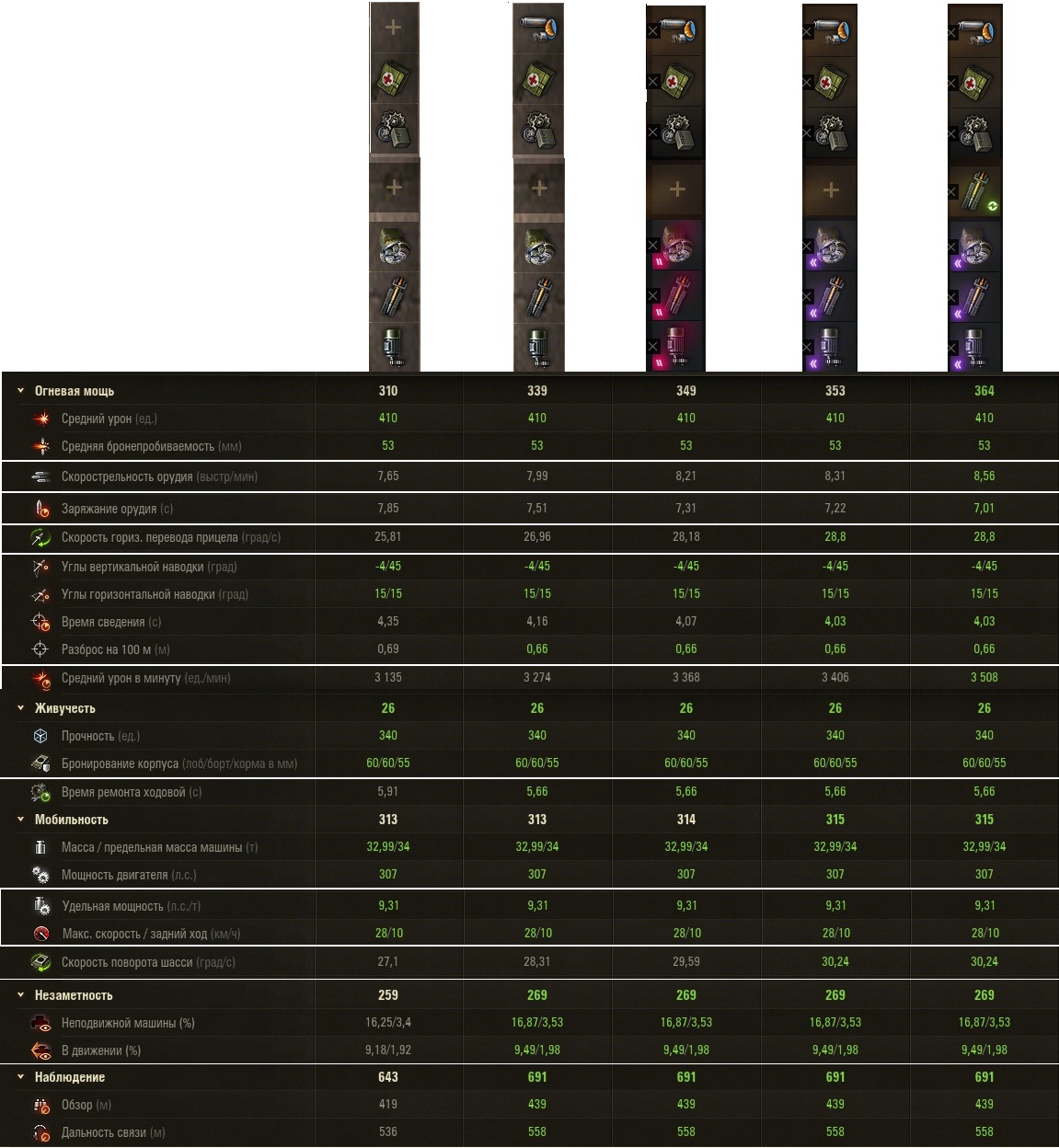 Апдейт на текущую ситуацию по оборудке. Вне конкуренции Досыл, Сведение и Улучшенные механизмы поворота. Доппаёк (Кофе) даёт максимальную прибавку к характеристикам по сравнению с любой другой опцией оснащения. Наиболее полезная инструкция Рациональная боеукладка. Прокачка обзора оптикой и трубой практически бесполезны - он и так близок к максимальному (+6м не роляют), а пересветить грамотно заточенного на обзор и маскировку светляка всё равно шансов нет. Маскировка, подбой или изменённая компоновка так же малополезны, поскольку выигрыш дадут менее эффективный, чем бонусы Улучшенных механизмов поворота. Аптечка и Ремка - большие, потому что у них ниже время подготовки к повторному использованию + бонусы к характеристикам машины/экипажа. ЗЫ: Сам езжу на стандартной оборудке, поскольку вся розовая/фиолетовая установлена топовым машинам.