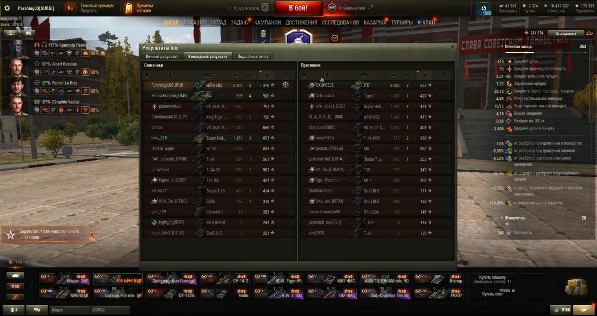 Поставил фиолетовый досыл и розовые УМП... Субъективно - разница относительно обычных не ощущается...))) Раньше на Левше качались экипажи всей ветки и выполнялись задачи. Нынче на Левше редко. Я теперь клановая арта, в первую очередь оснащались топы (конь и 261) Какие отметки...))) Никогда не играл на стату. Да и 4000 боёв в экспериментах для этой ветки не оставляют шансов)