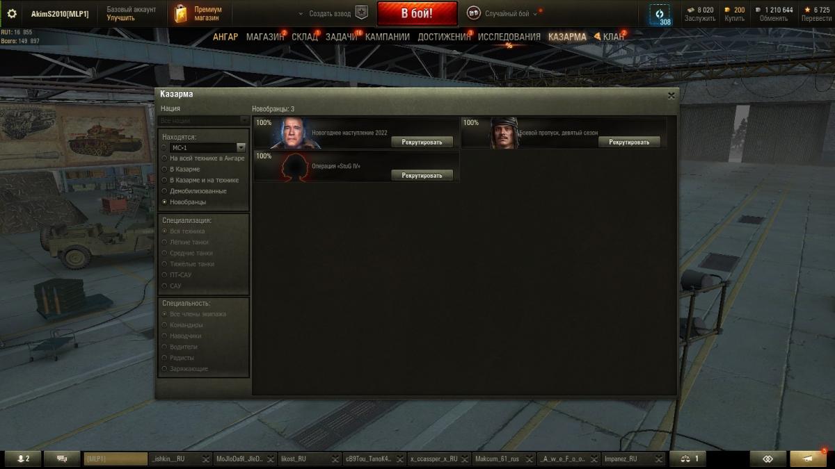 Здравствуйте, танкисты! У меня вопрос в том, что не сгорят ли у меня новобранцы в казарме? У меня вопрос к Арни, которого я еще не рекрутировал и командира за боевой пропуск.