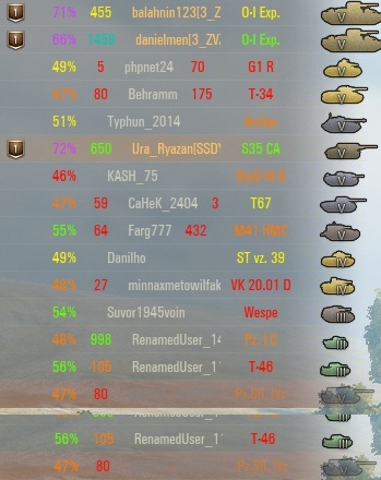 Ребят, вот вам файл где будите видеть процент побед , кол-во боев, и средний дамаг по танку у каждого, на котором в бою. По нажатию таб смотрите общую стату. Устанавливать тут C:\Games\World_of_Tanks\res_mods\configs\xvm\jove вот уже как года два пользуюсь этим. Благодарности приветствуются http://cdn-frm-eu.wargaming.net/4.3/style_emoticons/wot/Smile_Default.gif playersPanel.rar