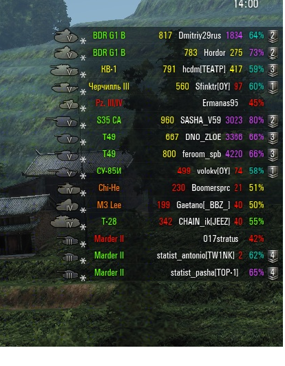 Здравствуйте , подскажите как сделать так, чтобы в ушах во время боя не накладывались показатели , Чтобы ник не заходил за цифры как на фото. К примеру справа от моего ника должны быть еще цифры показатели , а их съедает ник. Как исправить - это стало после последнего патча , до этого два года все норм было. К паримеру должно быть вот так как на фото 111111, ....где пробелы ставить, или что еще ? "nickFormatLeft": "{{t-rating%2d~%| }} {{t-battles%4d}} {{nick}} {{tdb%4d}} ", "nickFormatRight": " {{tdb%4d}} {{nick}} {{t-battles%4d}} {{t-rating%2d~%| }} ", // Display format for vehicle name (macros allowed, see macros.txt). // Формат отображения названия танка (допускаются макроподстановки, см. macros.txt). "vehicleFormatLeft": "{{vehicle}}", "vehicleFormatRight": "{{vehicle}}",